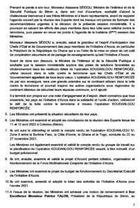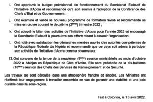 La 8ème session des ministres chargés de la sécurité des pays membres de l’Initiative d’Accra a pris fin dans la soirée de ce mercredi 13 avril 2022 au Novotel Hôtel de Cotonou. Les ministres de la sécurité et de la défense venus du Bénin, du Burkina Faso, de la Côte d’Ivoire, du Ghana, du Niger et du Togo ont eu des échanges sur divers points dont la teneur est consignée dans un communiqué final.
