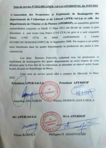 Après un long moment de silence sur l’application de l’arrêté ministériel de 2008 qui fixe le prix de grammage du pain à l’usine, les promoteurs et exploitants de boulangeries ont décidé d’appliquer l’arrêté 052/MIC/DC/SGM/DGCI/DPCI du 16 septembre 2008. Lire la note de service de la faîtière des promoteurs de boulangeries.