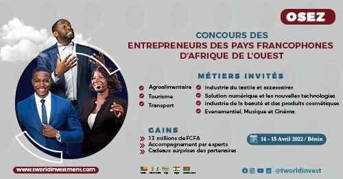 T World Investment (TWI) met à disposition des financements, des formations, accompagnements et suivis dans le but de donner vie à vos projets. A travers ses réseaux de partenaires, d’investisseurs, de donateurs et d’entrepreneurs, TWI développe un service d’accompagnement auprès des particuliers, porteurs de projets, startups et autres dans leurs parcours entrepreneuriaux partout dans le monde. Dans le cadre de ses activités annuelles, le groupe TWI organise les 14 et 15 avril 2022 dans la salle bleue du Palais des congrès de Cotonou, la phase finale du Concours OSEZ. La remise des prix se fera le samedi 16 avril 2022 suivi d’un showcase qui sera donné par plusieurs artistes béninois tels que Zeynab Habib, Jonh Arcadius, Gopal Das, K mal Radji, etc., dans la salle rouge du Palais des Congrès de Cotonou.