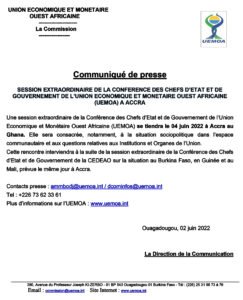 Toujours d’actualité, la situation sociopolitique au Burkina Faso, en Guinée et au Mali, continue de mobiliser les Chefs d’Etat de la sous-région. A Accra, ce samedi 04 juin, la Conférence des Chefs d’Etat et de Gouvernement de l’Union économique et monétaire ouest-africaine (Uemoa) se retrouve en session extraordinaire pour passer en revue la situation des différents pays concernés. Lire le communiqué de presse de la Commission de l’Uemoa.