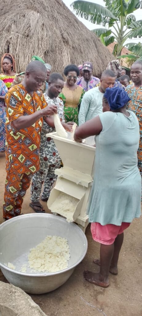 Les deux autres étapes de la tournée ont été consacrées aux groupements de femmes, « Djro Mahouton » et « Fifadji », spécialisés respectivement dans la transformation des noix de palme en huile rouge et du manioc en gari. L’honorable DEGBEDJI a remarqué que certaines de ces femmes rencontraient des difficultés dues au manque d’outils adéquats pour leurs activités. Elle a décidé d’intervenir en leur fournissant les équipements nécessaires, tels que des machines pour broyer et presser les noix de palme, ainsi que des moulins pour le manioc.