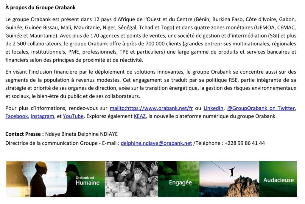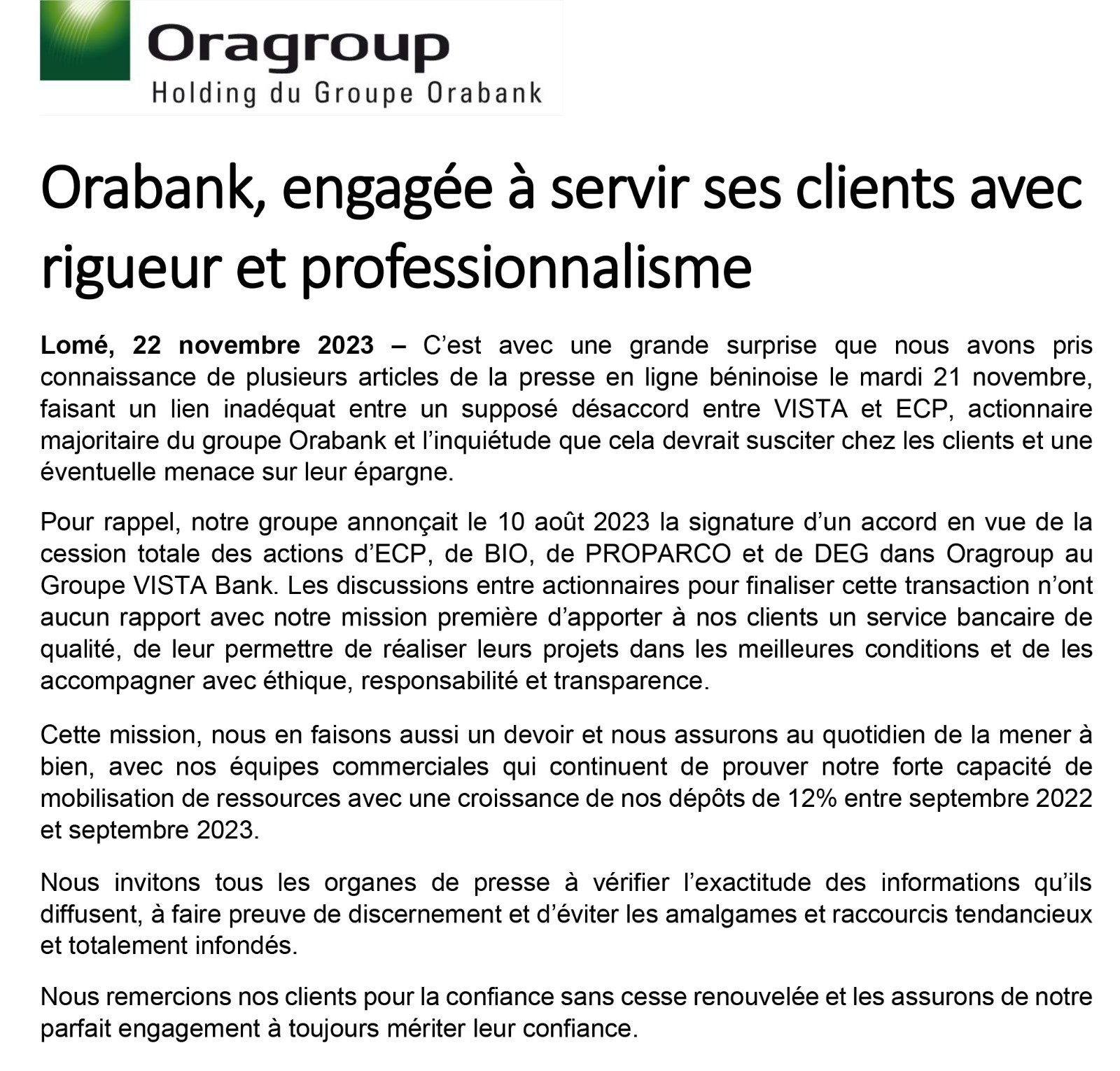 Orabank, engagée à servir ses clients avec rigueur et professionnalisme. C’est avec une grande surprise que nous avons pris connaissance de plusieurs articles de la presse en ligne béninoise, le mardi 21 novembre 2023, faisant un lien inadéquat entre un supposé désaccord entre VISTA et ECP, actionnaire majoritaire du groupe Orabank et l’inquiétude que cela devrait susciter chez les clients et une éventuelle menace sur leur épargne.