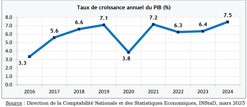 Avec un taux de croissance de 7,5 % enregistré en 2024, selon l’Institut national de la statistique et de la démographie (Instad), le Produit intérieur brut (Pib) du Bénin dépasse largement la moyenne de l’Union économique et monétaire ouest-africaine (Uemoa). Cette performance repose sur trois piliers essentiels à savoir l’agriculture (26 % du Pib), les services (49 %) et l’industrie (23 %).