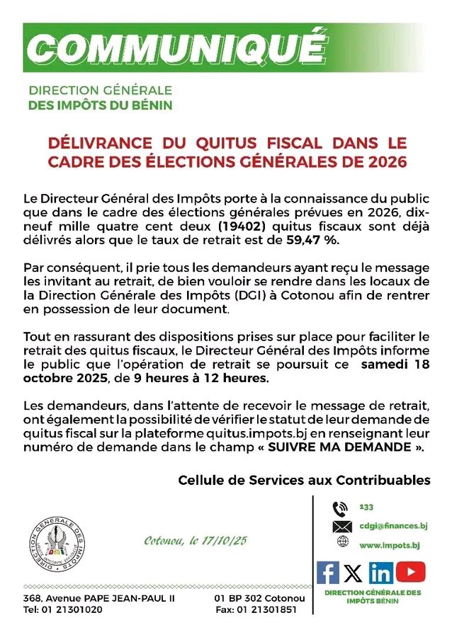 Dans un communiqué publié le 17 octobre 2025, la DGI invite tous les bénéficiaires ayant reçu une notification de disponibilité à se rendre dans ses bureaux à Cotonou pour récupérer leur quitus.
