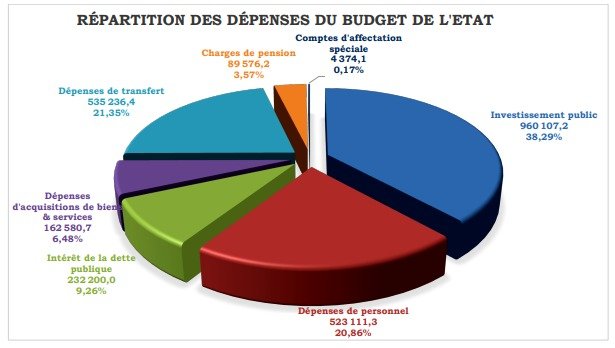 Au terme des douze mois de l’année 2024, les recettes budgétaires collectées au profit du budget de l’État s’élèvent à 2 117 541,9 millions de FCFA. Ce montant dépasse la prévision annuelle de 2 076 000 millions de FCFA, atteignant ainsi un taux de réalisation de 102,0 %. Par rapport à l’année précédente, 2023, on observe une augmentation significative de 7,5 % des recettes, ce qui témoigne d’une dynamique positive dans la collecte des fonds publics. En ce qui concerne les dépenses, l’État a mis en place une répartition stratégique de ses ressources pour répondre aux besoins essentiels de la population et soutenir le développement économique. Pour chaque tranche de 10 000 FCFA dépensé, les allocations budgétaires se répartissent comme suit : 3 974 FCFA sont consacrés aux services économiques, englobant des secteurs cruciaux tels que l’agriculture, le commerce, l’industrie, ainsi que les infrastructures routières et énergétiques.