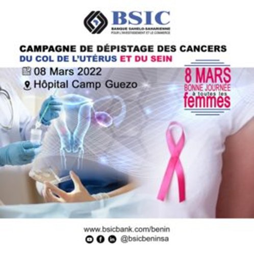 Dans le cadre de la Journée Internationale de la Femme, la Banque Sahélo Saharienne pour l`Investissement et le Commerce (BSIC BENIN) se mobilise pour la lutte contre les cancers du col de l’utérus et du sein. Pour cette journée, la BSIC BENIN organise une campagne de dépistage des cancers du col de l’utérus et du sein le 08 Mars 2022 à l’hôpital Camp Guézo.