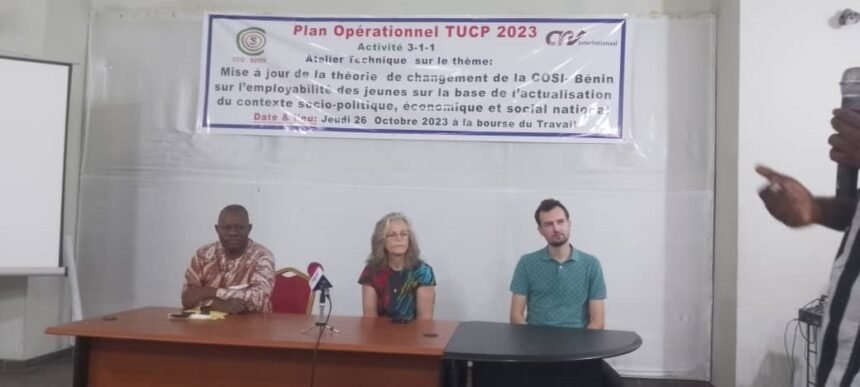 La Confédération des organisations syndicales indépendantes du Bénin (COSI Bénin) a organisé ce jeudi 26 octobre 2023 à la Bourse du Travail, un atelier sur la Mise à jour de la théorie de changement de la Cosi Bénin sur l’employabilité des jeunes sur la base de l’actualisation du contexte socio-politique, économique et social national. C’est une séance de concertation et de validation des différents éléments.