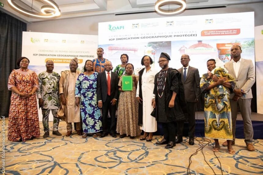 Outil de développement agricole en ce sens qu’elle valorise les produits agricoles en associant leur qualité et leur réputation à leur origine géographique et aux savoir-faire locaux, l’Indication Géographique Protégée (IGP) s’accorde à de nouveaux produits « Made in Benin ». Après l’ananas « Pain de sucre », c’est au tour du « Gari Sohoui » de Savalou et de l’huile « Azimi d’Agonlin » d’être certifiés IGP. Respectivement 22ème et 23ème Indications géographiques protégées, ces enregistrements publiés au bulletin officiel de la propriété industrielle de l’OAPI le 30 septembre 2025 sous le numéro 02-2025, ont officiellement été remis aux officiels béninois, le samedi 18 octobre 2025. Intervenant dans un contexte où le Bénin célèbre le « Mois du Consommons Local », au même titre que les pays de l’Union, cette reconnaissance, selon Michel Gonomy, Responsable IGP à l’OAPI, revêt une double dimension, notamment juridique et dimension institutionnelle et culturelle. Sur le plan juridique, cette reconnaissance confère à ces deux produits le statut de propriété intellectuelle dans les 17 Etats membres que compte actuellement l’OAPI. « Cela signifie que le « Gari Sohoui » de Savalou et l’Huile « Azimi d’Agonlin » sont des appellations protégées par la loi. Elles ne doivent plus être utilisées comme des appellations banales, génériques, en référence à des produits autres que ceux qui viennent des terroirs conservés.