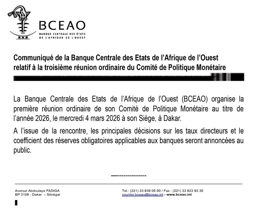La Banque Centrale des Etats de l’Afrique de l’Ouest (BCEAO) organise la première réunion ordinaire de son Comité de Politique Monétaire au titre de l’année 2026, le mercredi 4 mars 2026 à son Siège, à Dakar. A l’issue de la rencontre, les principales décisions sur les taux directeurs et le coefficient des réserves obligatoires applicables aux banques seront annoncées au public.