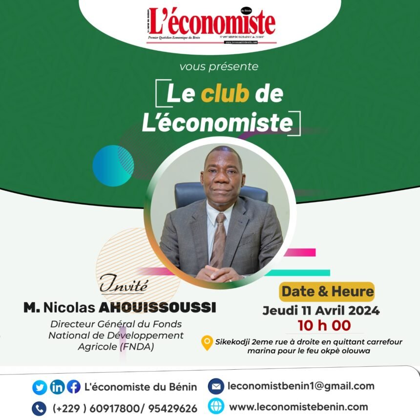 Le Directeur général du Fonds National de Développement Agricole (FNDA), Nicolas Ahouissoussi sera l’invité du Club de L’économiste ce jeudi 11 avril 2024. En face des journalistes, le DG va passer au peigne fin les actions du FNDA.