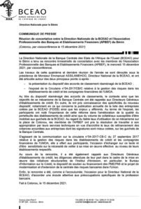 La Direction Nationale de la Banque Centrale des Etats de l’Afrique de l’Ouest (BCEAO) pour le Bénin a tenu sa rencontre trimestrielle de concertation avec les membres de l’Association Professionnelle des Banques et Etablissements Financiers (APBEF), le mercredi 15 décembre 2021, par visioconférence. Les travaux de cette quatrième et dernière réunion de l’année 2021 se sont déroulés sous la présidence de Monsieur Emmanuel ASSILAMEHOO, Directeur National de la BCEAO. La rencontre a eu lieu autour de deux points. Il s’agit de la présentation du dispositif des accords de classement réaménagé de la BCEAO et de l’exposé de la Circulaire n°04-2017/CB/C relative à la gestion des risques dans les établissements de crédit et les compagnies financières de l’UMOA. Au cours de la rencontre, il a été également rappelé aux Directeurs Généraux d’établissements de crédit, les diligences attendues de leur part dans le cadre de la mise en œuvre des initiatives structurantes de l’Institut d’émission, en particulier, le Bureau d’Information sur le Crédit, le dispositif de soutien au financement des PME/PMI et le projet de modernisation et d’extension de la centrale des risques bancaires dans l’Union.