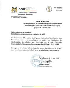 L’opération de régularisation des résidus pour l’inscription sur la Liste Électorale Informatisée (LEI) de l’Agence nationale d’identification des personnes (ANIP) est prorogée jusqu’au Vendredi 22 avril 2022 à 16h.