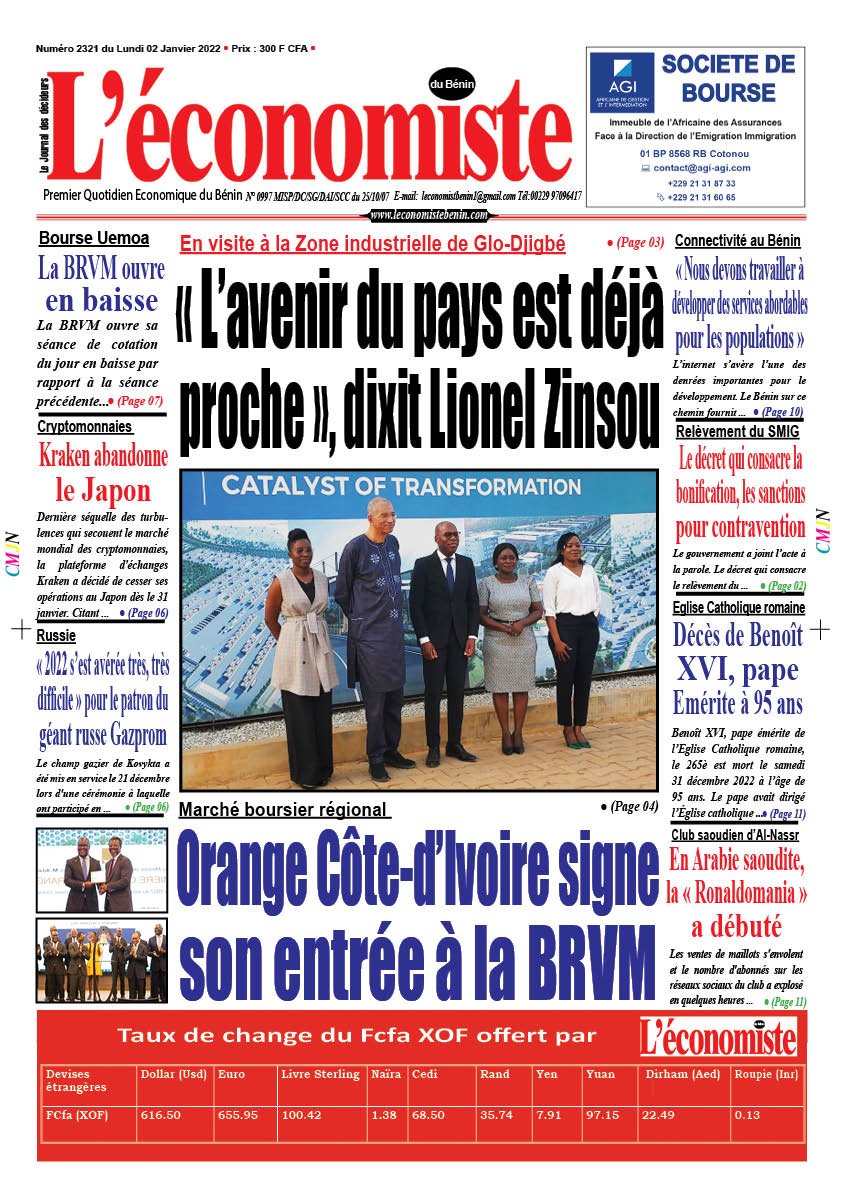 DERNIERES PARUTIONSParution du 02 01 2023 Dernière mise à jour: janvier 1, 2023 8:58 pm Houefa Publié janvier 1, 2023 Partager PARTAGER Vous Aimerez Aussi Parution du 18 11 2022 Parution du 15 03 2023 Parution du 24 10 2022 Parution du 02 02 2024 Parution du 06 01 2023 Partager Cet Article Facebook Pinterest Whatsapp Whatsapp LinkedIn Télégramme E-mail Imprimer Article Précédent Relèvement qui SMIG au Bénin : La bonification des salaires, les sanctions actées par décret Prochain Article Inclusion sociale des personnes porteuses de handicaps : « …défiscalisation totale de tous les véhicules permettant aux personnes à mobilité réduite de circuler » RechercherRechercherDerniers articlesExportation de produits agricoles du Bénin: L’ananas pain de sucre conquiert le marché chinoisPrésidentielle 2026: Le duo Wadagni–Talata dévoile sa vision pour le Bénin ce samediSIRAT Pay : une solution digitale pour fluidifier les péagesArt conceptuel: Thierry Oussou expose « Equilibrium Wind » du 21 mars au 18 avril 2026Résultats provisoires au Congo : Denis Sassou Nguesso réélu avec plus de 94 %CommentairesAucun commentaire à afficher.