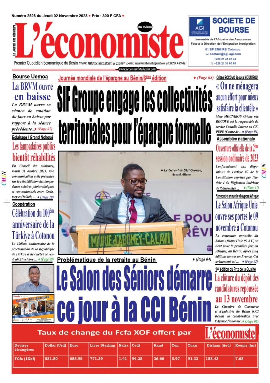 DERNIERES PARUTIONSParution du 02 11 2023 Dernière mise à jour: novembre 2, 2023 10:20 am la rédaction Publié novembre 2, 2023 Partager PARTAGER Vous Aimerez Aussi Parution du 17 01 2023 Parution du 02 10 2023 Parution du 24 01 2023 Parution du 19 01 2023 Parution du 28 09 2023 Partager Cet Article Facebook Pinterest Whatsapp Whatsapp LinkedIn Télégramme E-mail Imprimer Article Précédent Assemblée nationale : Ouverture officielle de la 2ème session ordinaire de 2023 Prochain Article Assemblée nationale : 81 députés ont voté le deuxième rapport d’activités RechercherRechercherDerniers articlesSemaine Boursière à la BRVM : Une Élan entre Montées et BaisseEntretien avec Dr. Asma Razgallah,Présidente-Fondatrice de Strat.IN CanadaRéalisation de garderie à l’UAC: Le Japon alloue plus 50 millions FCFA à l’Ong « Graines de Paix-Bénin »Renforcement des entrepreneurs à l’export: La CCI Bénin outille les entreprises à l’accès aux marchés internationauxLibre-échange en Afrique: ZLECAF, l’une des priorités de la CEDEAO en 2026CommentairesAucun commentaire à afficher.