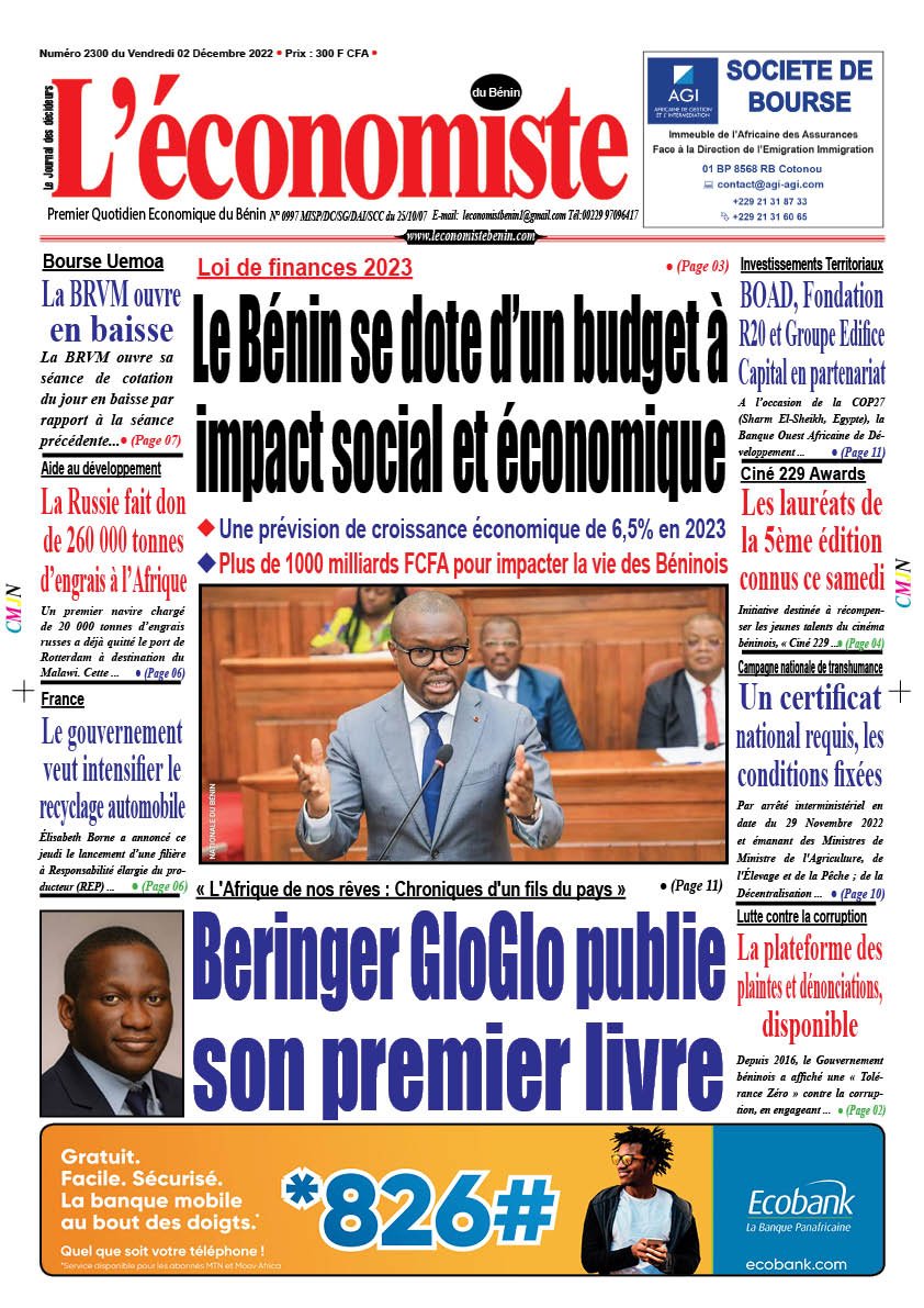DERNIERES PARUTIONSParution du 02 12 2022 Dernière mise à jour: décembre 5, 2022 10:12 am Houefa Publié décembre 1, 2022 Partager PARTAGER Vous Aimerez Aussi Parution du 14 12 2022 Parution du 31 03 2023 Parution du 28 03 2023 Parution du 16 01 2022 Parution du 05 04 2023 Partager Cet Article Facebook Pinterest Whatsapp Whatsapp LinkedIn Télégramme E-mail Imprimer Article Précédent Loi de finances 2023 : Le Bénin se dote d’un budget à impact social et économique Prochain Article Projets des villes intelligentes : Beaucoup sont au point mort Leave a CommentLaisser un commentaire Annuler la réponseVotre adresse e-mail ne sera pas publiée. Les champs obligatoires sont indiqués avec *Commentaire *Nom * E-mail * Site web Enregistrer mon nom, mon e-mail et mon site dans le navigateur pour mon prochain commentaire. ΔRechercherRechercherDerniers articlesSemaine Boursière à la BRVM : Une Élan entre Montées et BaisseEntretien avec Dr. Asma Razgallah,Présidente-Fondatrice de Strat.IN CanadaRéalisation de garderie à l’UAC: Le Japon alloue plus 50 millions FCFA à l’Ong « Graines de Paix-Bénin »Renforcement des entrepreneurs à l’export: La CCI Bénin outille les entreprises à l’accès aux marchés internationauxLibre-échange en Afrique: ZLECAF, l’une des priorités de la CEDEAO en 2026CommentairesAucun commentaire à afficher.