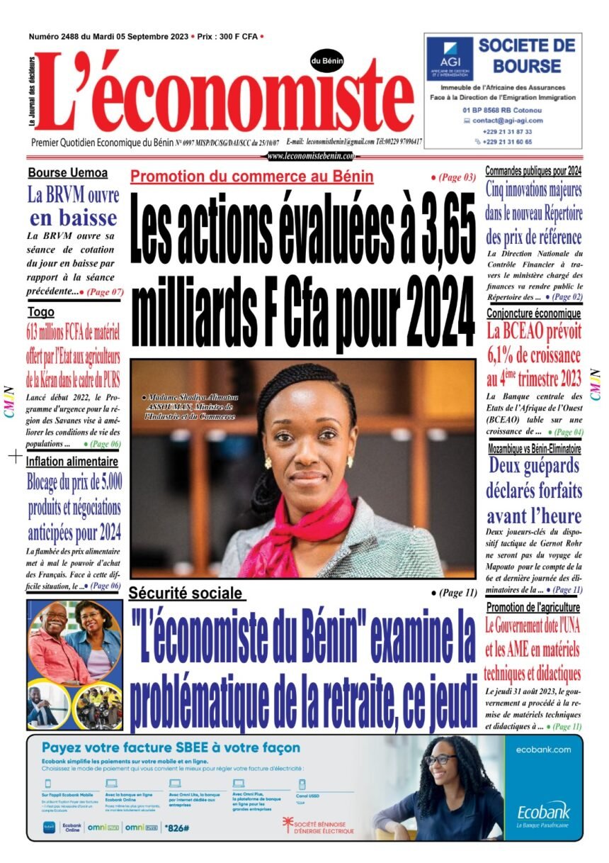 DERNIERES PARUTIONSParution du 05 09 2023 Dernière mise à jour: septembre 5, 2023 9:31 am la rédaction Publié septembre 5, 2023 Partager 0 Min en Lecture PARTAGER Vous Aimerez Aussi Parution du 06 11 2023 Parution du 23 11 2022 Parution du 06 02 2023 Parution du 04 11 2022 Parution du 14 07 2023 Partager Cet Article Facebook Pinterest Whatsapp Whatsapp LinkedIn Télégramme E-mail Imprimer Article Précédent Conjoncture économique de juillet 2023 : La BCEAO prévoit 6,1% de croissance au 4ème trimestre 2023 Prochain Article Assemblée Nationale/séminaire d’évaluation des politiques publiques : La planification du développement au cœur d’une loi-cadre RechercherRechercherDerniers articlesUEMOA : La Cour de justice lève les sanctions contre le MaliAccès à l’Energie au Bénin: 09 mini-réseaux solaires ruraux financés par CEI Africa et Energise AfricaeGouvernance au Bénin: « 229 Cadre de Vie », une plateforme pour agir sur l’incivismeActivités économiques au Bénin: Le marché moderne de Cococodji ouvre officiellement ses portesSecteur bancaire au Bénin: BANGE BANK étend son réseau avec l’agence STEINMETZCommentairesAucun commentaire à afficher.