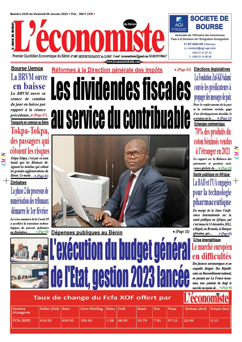 DERNIERES PARUTIONSParution du 06 01 2023 Dernière mise à jour: janvier 5, 2023 11:10 pm Houefa Publié janvier 5, 2023 Partager PARTAGER Vous Aimerez Aussi Parution du 24 01 2023 Parution du 14 03 2023 Parution du 22 05 2023 Parution du 24 03 2023 Parution du 08 03 2023 Partager Cet Article Facebook Pinterest Whatsapp Whatsapp LinkedIn Télégramme E-mail Imprimer Article Précédent Réformes à la Direction générale des impôts : Les dividendes fiscales au service du contribuable Prochain Article Crise alimentaire en Afrique : La Banque mondiale appelle à transformer le marché des engrais et soutenir les petits agriculteurs RechercherRechercherDerniers articlesPromotion des affaires: Echange entre des hommes d’affaires japonais et l’ADPMEVente de services de connexion à Internet: L’ARCEP Bénin invite les acteurs des « Wi-Fi Zones » au respect des textesSecteur bancaire: UBA BENIN, banque de l’année 2025 au BéninOuverture de la BRVM : Un Marché en Légère ProgressionOpportunité d’étude à l’extérieur: 16 Bourses internationales offertes aux étudiantsCommentairesAucun commentaire à afficher.
