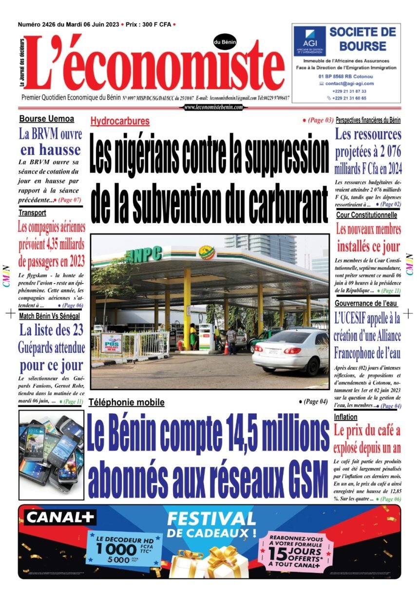 DERNIERES PARUTIONSParution du 06 06 2023 Dernière mise à jour: juin 6, 2023 12:25 am la rédaction Publié juin 6, 2023 Partager PARTAGER Vous Aimerez Aussi Parution du 29 08 2023 Parution du 29 09 2023 Parution du 28 02 2023 Parution du 04 08 2023 Parution 07 07 2023 Partager Cet Article Facebook Pinterest Whatsapp Whatsapp LinkedIn Télégramme E-mail Imprimer Article Précédent Perspectives financières du Bénin : Les ressources projetées à 2 076 milliards F Cfa en 2024 Prochain Article Africa CEO forum, 9ème édition : L’émergence de la prochaine génération de champions africains préoccupe RechercherRechercherDerniers articlesSemaine Boursière à la BRVM : Une Élan entre Montées et BaisseEntretien avec Dr. Asma Razgallah,Présidente-Fondatrice de Strat.IN CanadaRéalisation de garderie à l’UAC: Le Japon alloue plus 50 millions FCFA à l’Ong « Graines de Paix-Bénin »Renforcement des entrepreneurs à l’export: La CCI Bénin outille les entreprises à l’accès aux marchés internationauxLibre-échange en Afrique: ZLECAF, l’une des priorités de la CEDEAO en 2026CommentairesAucun commentaire à afficher.
