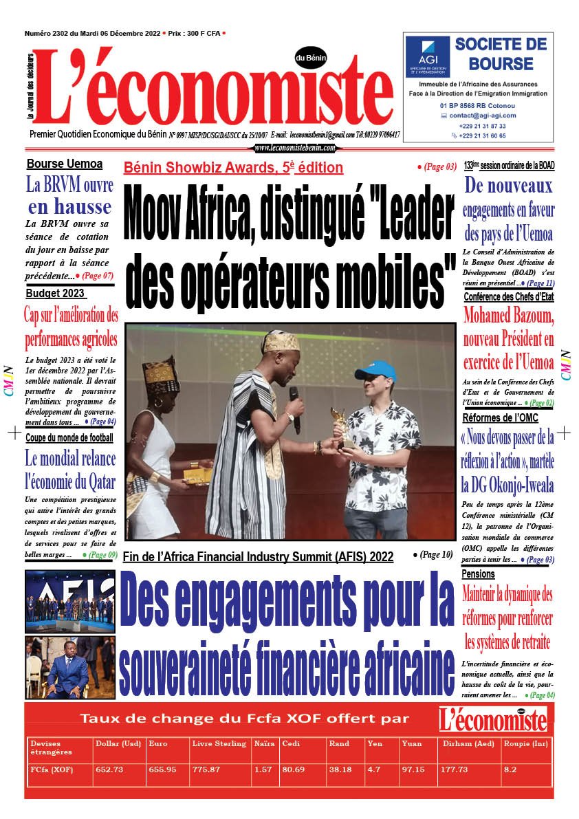 DERNIERES PARUTIONSParution du 06 12 2022 Dernière mise à jour: décembre 5, 2022 10:45 pm Houefa Publié décembre 5, 2022 Partager PARTAGER Vous Aimerez Aussi Parution du 17 10 22 Parution du 07 11 2022 Parution du 20 03 2023 Parution du 02 10 2023 Parution du 15 05 2023 Partager Cet Article Facebook Pinterest Whatsapp Whatsapp LinkedIn Télégramme E-mail Imprimer Article Précédent Bénin Showbiz Awards, 5è édition : Moov Africa, distingué « Leader des opérateurs mobiles du Bénin» Prochain Article Transformation de l’économie africaine : L’édition 2022 des Financial Afrik Awards 2022 ce jeudi 08 Décembre 2022 à Lomé Leave a CommentLaisser un commentaire Annuler la réponseVotre adresse e-mail ne sera pas publiée. Les champs obligatoires sont indiqués avec *Commentaire *Nom * E-mail * Site web Enregistrer mon nom, mon e-mail et mon site dans le navigateur pour mon prochain commentaire. ΔRechercherRechercherDerniers articlesPrésidentielle 2026: Le duo Wadagni–Talata dévoile sa vision pour le Bénin ce samediSIRAT Pay : une solution digitale pour fluidifier les péagesArt conceptuel: Thierry Oussou expose « Equilibrium Wind » du 21 mars au 18 avril 2026Résultats provisoires au Congo : Denis Sassou Nguesso réélu avec plus de 94 %Audience à l’Assemblée nationale: Le président Joseph Djogbénou reçoit l’ambassadeur du JaponCommentairesAucun commentaire à afficher.