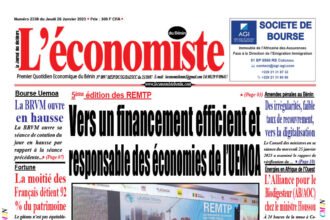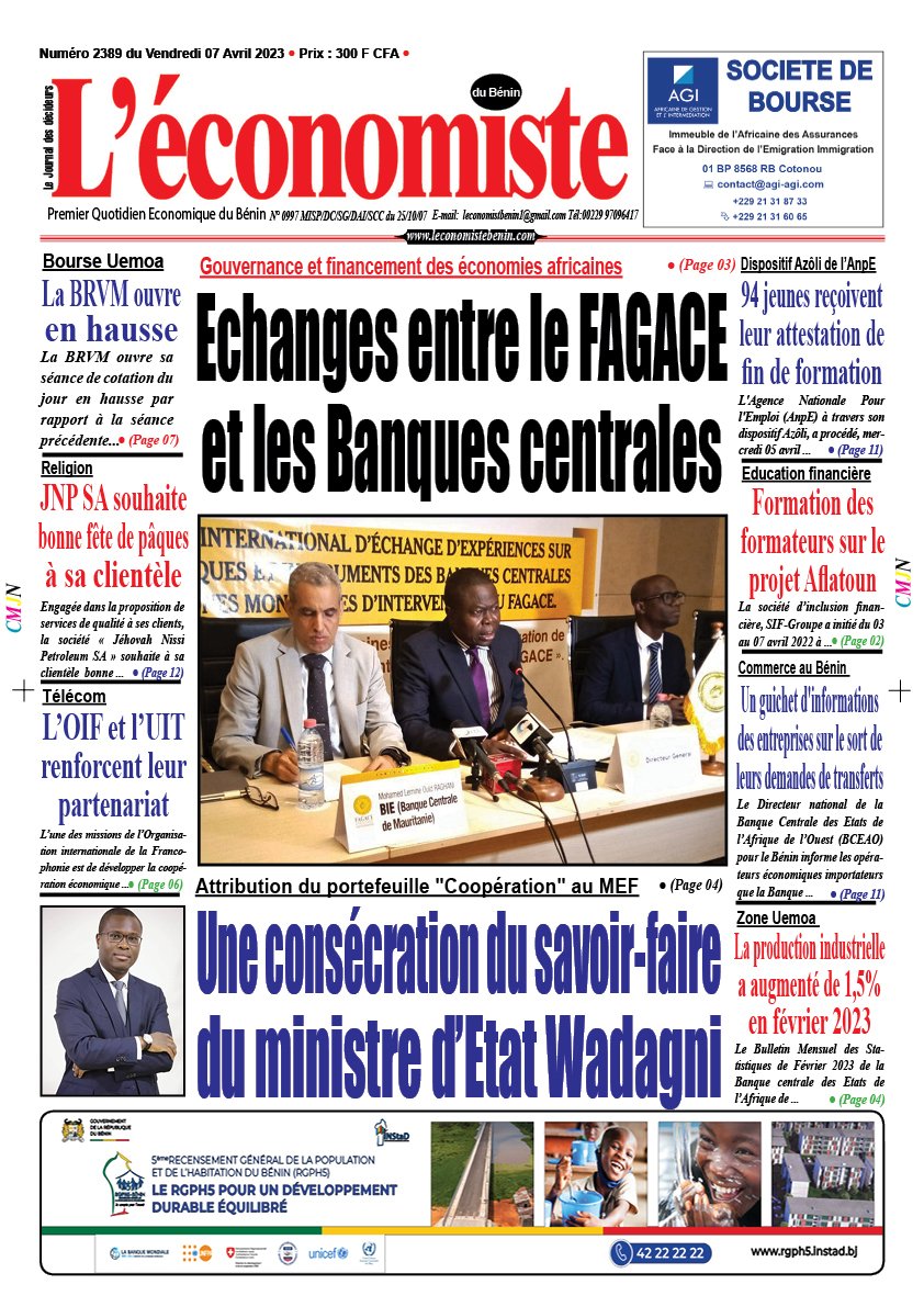 DERNIERES PARUTIONSParution du 07 04 2023 Dernière mise à jour: avril 7, 2023 12:12 am Houefa Publié avril 7, 2023 Partager PARTAGER Vous Aimerez Aussi Parution du 10 03 2023 Parution du 28 12 2022 Parution du 08 11 2022 Parution du 24 02 2023 Parution du 16 02 2023 Partager Cet Article Facebook Pinterest Whatsapp Whatsapp LinkedIn Télégramme E-mail Imprimer Article Précédent Gouvernance et financement des économies africaines : Echanges entre le FAGACE et les Banques centrales Prochain Article Mise en œuvre du CAP 2025:La convergence des économies occupe les Représentants Résidents de l’Uemoa RechercherRechercherDerniers articlesEntrepreneuriat au Bénin: BIO Invest engage 3 millions d’euros dans Vital Finance pour les PMEMarché des titres publics: 8ᵉ édition des Rencontres du Marché des Titres Publics (REMTP), les 27et 28 à LoméStabilité macroéconomique: Un taux de croissance de 6,9 % dans l’UEMOA à fin 2025Accompagnement et suivi des entreprises: La CCI Bénin projette une croissance de 91% aux PME en 2026Dynamisme à la BRVM : Les Valeurs Bancaires et Industrielles en TêteCommentairesAucun commentaire à afficher.
