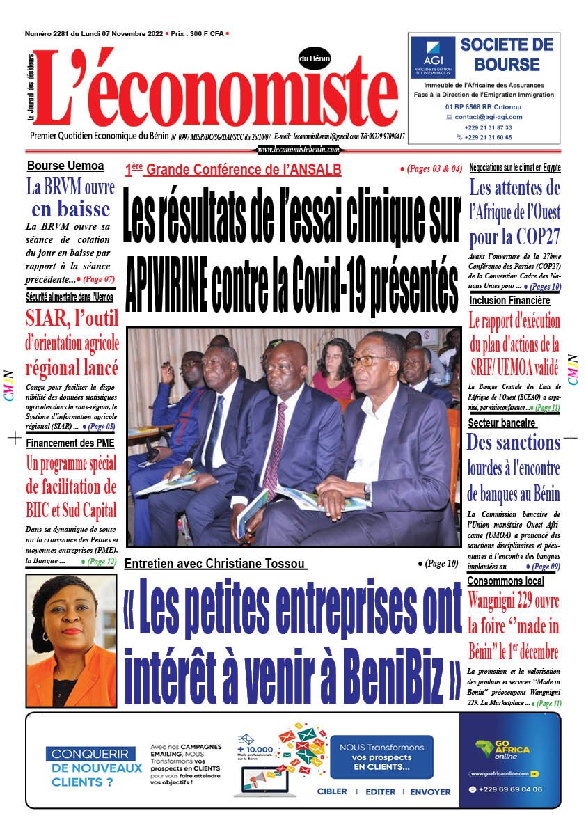 DERNIERES PARUTIONSParution du 07 11 2022 Dernière mise à jour: novembre 6, 2022 10:58 pm Houefa Publié novembre 6, 2022 Partager PARTAGER Vous Aimerez Aussi Parution du 05 12 2022 Parution du 06 10 2023 Parution du 16 12 2022 Parution du 19 10 2023 Parution du 28 07 2023 Partager Cet Article Facebook Pinterest Whatsapp Whatsapp LinkedIn Télégramme E-mail Imprimer Article Précédent 1ère Grande Conférence de l’ANSALB : Les résultats de l’essai clinique sur APIVIRINE contre la Covid-19 présentés Prochain Article Financement des économies : L’engagement de la BOAD s’exprime à la COP 27 en Egypte Leave a CommentLaisser un commentaire Annuler la réponseVotre adresse e-mail ne sera pas publiée. Les champs obligatoires sont indiqués avec *Commentaire *Nom * E-mail * Site web Enregistrer mon nom, mon e-mail et mon site dans le navigateur pour mon prochain commentaire. ΔRechercherRechercherDerniers articlesEntrepreneuriat au Bénin: BIO Invest engage 3 millions d’euros dans Vital Finance pour les PMEMarché des titres publics: 8ᵉ édition des Rencontres du Marché des Titres Publics (REMTP), les 27et 28 à LoméStabilité macroéconomique: Un taux de croissance de 6,9 % dans l’UEMOA à fin 2025Accompagnement et suivi des entreprises: La CCI Bénin projette une croissance de 91% aux PME en 2026Dynamisme à la BRVM : Les Valeurs Bancaires et Industrielles en TêteCommentairesAucun commentaire à afficher.