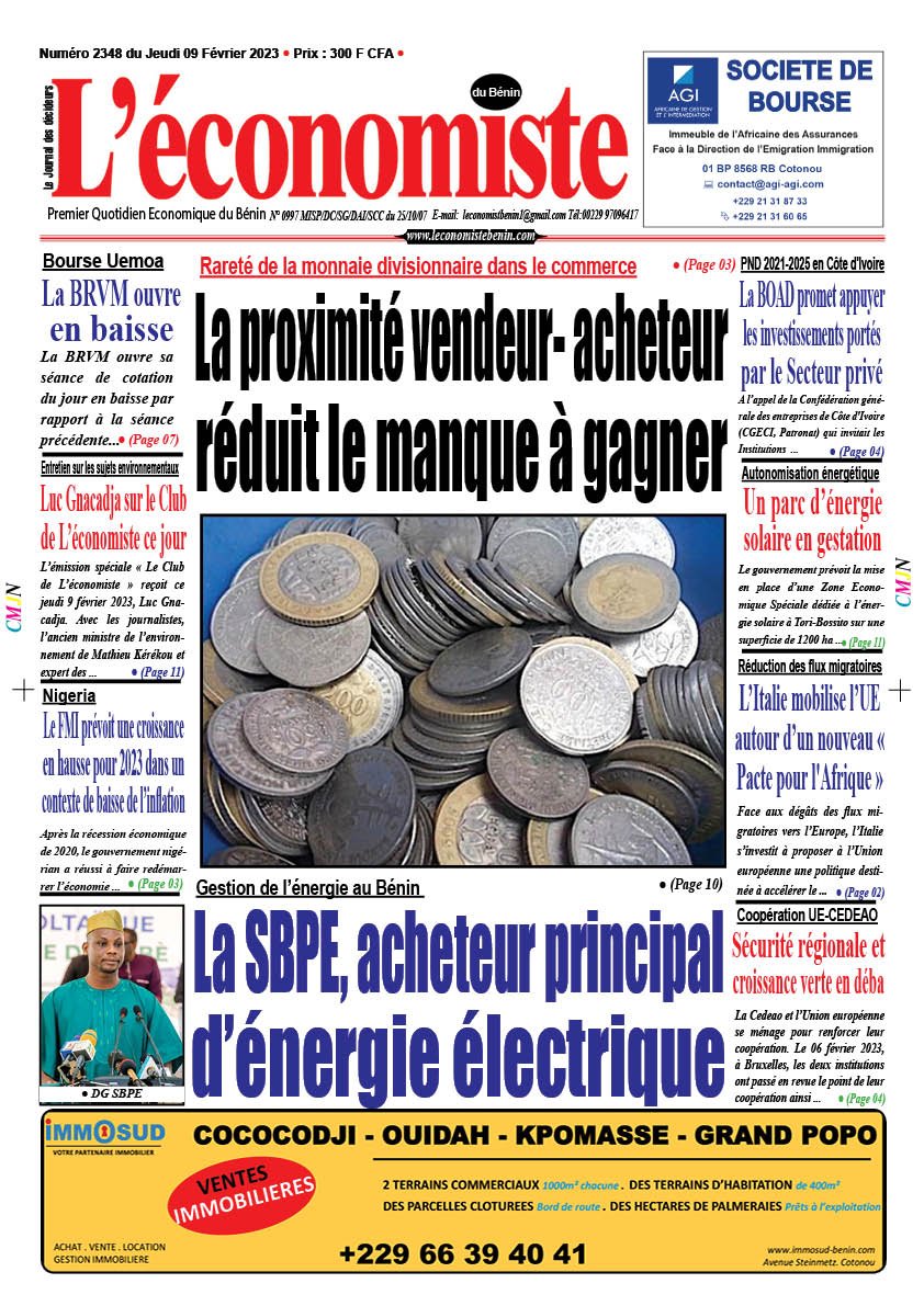 DERNIERES PARUTIONSParution du 08 02 2023 Dernière mise à jour: février 8, 2023 9:57 pm Houefa Publié février 8, 2023 Partager PARTAGER Vous Aimerez Aussi Parution du 25 08 2023 Parution du 31 01 2023 Parution du 14 12 2022 Parution du 04 11 2022 Parution du 11 01 2023 Partager Cet Article Facebook Pinterest Whatsapp Whatsapp LinkedIn Télégramme E-mail Imprimer Article Précédent Rareté de la monnaie divisionnaire dans le commerce : La proximité vendeur- acheteur réduit le manque à gagner Prochain Article Habitats en Afrique : Partenariat Shelter Afrique-Actis pour des logements abordables RechercherRechercherDerniers articlesEntrepreneuriat au Bénin: BIO Invest engage 3 millions d’euros dans Vital Finance pour les PMEMarché des titres publics: 8ᵉ édition des Rencontres du Marché des Titres Publics (REMTP), les 27et 28 à LoméStabilité macroéconomique: Un taux de croissance de 6,9 % dans l’UEMOA à fin 2025Accompagnement et suivi des entreprises: La CCI Bénin projette une croissance de 91% aux PME en 2026Dynamisme à la BRVM : Les Valeurs Bancaires et Industrielles en TêteCommentairesAucun commentaire à afficher.