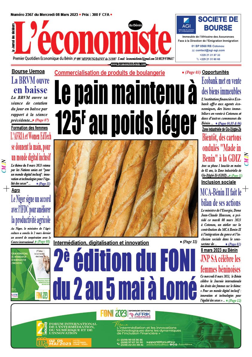 DERNIERES PARUTIONSParution du 08 03 2023 Dernière mise à jour: mars 8, 2023 12:56 pm Houefa Publié mars 8, 2023 Partager PARTAGER Vous Aimerez Aussi Parution du 04 04 2023 1ère édition du Prix de la Qualité et de la Performance : La clôture du dépôt des candidatures repoussée au 13 novembre Parution du 25 08 2023 Parution du 13 01 12 Parution du 06 09 2023 Partager Cet Article Facebook Pinterest Whatsapp Whatsapp LinkedIn Télégramme E-mail Imprimer Article Précédent Commercialisation de produits de boulangerie : Le pain maintenu à 125F au poids léger Prochain Article Coopération bilatérale : Macron reçoit à nouveau Talon à l’Élysée RechercherRechercherDerniers articlesSemaine Boursière à la BRVM : Une Élan entre Montées et BaisseEntretien avec Dr. Asma Razgallah,Présidente-Fondatrice de Strat.IN CanadaRéalisation de garderie à l’UAC: Le Japon alloue plus 50 millions FCFA à l’Ong « Graines de Paix-Bénin »Renforcement des entrepreneurs à l’export: La CCI Bénin outille les entreprises à l’accès aux marchés internationauxLibre-échange en Afrique: ZLECAF, l’une des priorités de la CEDEAO en 2026CommentairesAucun commentaire à afficher.