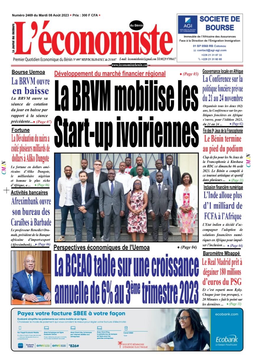 DERNIERES PARUTIONSParution du 08 08 2023 Dernière mise à jour: août 8, 2023 1:03 am la rédaction Publié août 8, 2023 Partager PARTAGER Vous Aimerez Aussi Parution du 03 10 2023 Parution du 15 09 2023 Parution du 16 10 2023 Parution du 17 10 2023 Parution du 15 02 2023 Partager Cet Article Facebook Pinterest Whatsapp Whatsapp LinkedIn Télégramme E-mail Imprimer Article Précédent Développement du marché financier régional : La BRVM mobilise les Start-up ivoiriennes Prochain Article Partenariat Fructueux entre le Bénin et la BADEA : Trois Accords Majeurs Signés pour Stimuler le Développement RechercherRechercherDerniers articlesOpportunité d’étude à l’extérieur: 16 Bourses internationales offertes aux étudiantsEntrepreneuriat au Bénin: BIO Invest engage 3 millions d’euros dans Vital Finance pour les PMEMarché des titres publics: 8ᵉ édition des Rencontres du Marché des Titres Publics (REMTP), les 27et 28 à LoméStabilité macroéconomique: Un taux de croissance de 6,9 % dans l’UEMOA à fin 2025BRVM : Une Clôture Positive Sous l’Influence des Valeurs Bancaires et IndustriellesCommentairesAucun commentaire à afficher.
