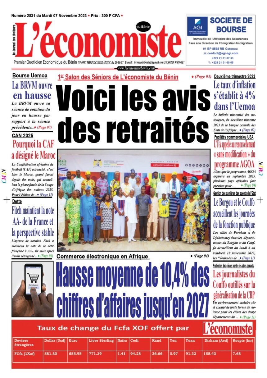 DERNIERES PARUTIONSParution du 08 11 2023 Dernière mise à jour: novembre 9, 2023 5:25 pm la rédaction Publié novembre 9, 2023 Partager PARTAGER Vous Aimerez Aussi Parution du 02 10 2023 Parution du 19 12 2022 Parution 25 10 2022 Parution du 06 12 2022 Parution du 26 06 2023 Partager Cet Article Facebook Pinterest Whatsapp Whatsapp LinkedIn Télégramme E-mail Imprimer Article Précédent Report du Jubilé du Cinquantenaire de la BOAD : Le Président de la Banque Opte pour la Prudence Prochain Article Secteur privé communautaire : La CCR-Uemoa adopte son Plan d’Actions et de Budget 2024 RechercherRechercherDerniers articlesSemaine Boursière à la BRVM : Une Élan entre Montées et BaisseEntretien avec Dr. Asma Razgallah,Présidente-Fondatrice de Strat.IN CanadaRéalisation de garderie à l’UAC: Le Japon alloue plus 50 millions FCFA à l’Ong « Graines de Paix-Bénin »Renforcement des entrepreneurs à l’export: La CCI Bénin outille les entreprises à l’accès aux marchés internationauxLibre-échange en Afrique: ZLECAF, l’une des priorités de la CEDEAO en 2026CommentairesAucun commentaire à afficher.