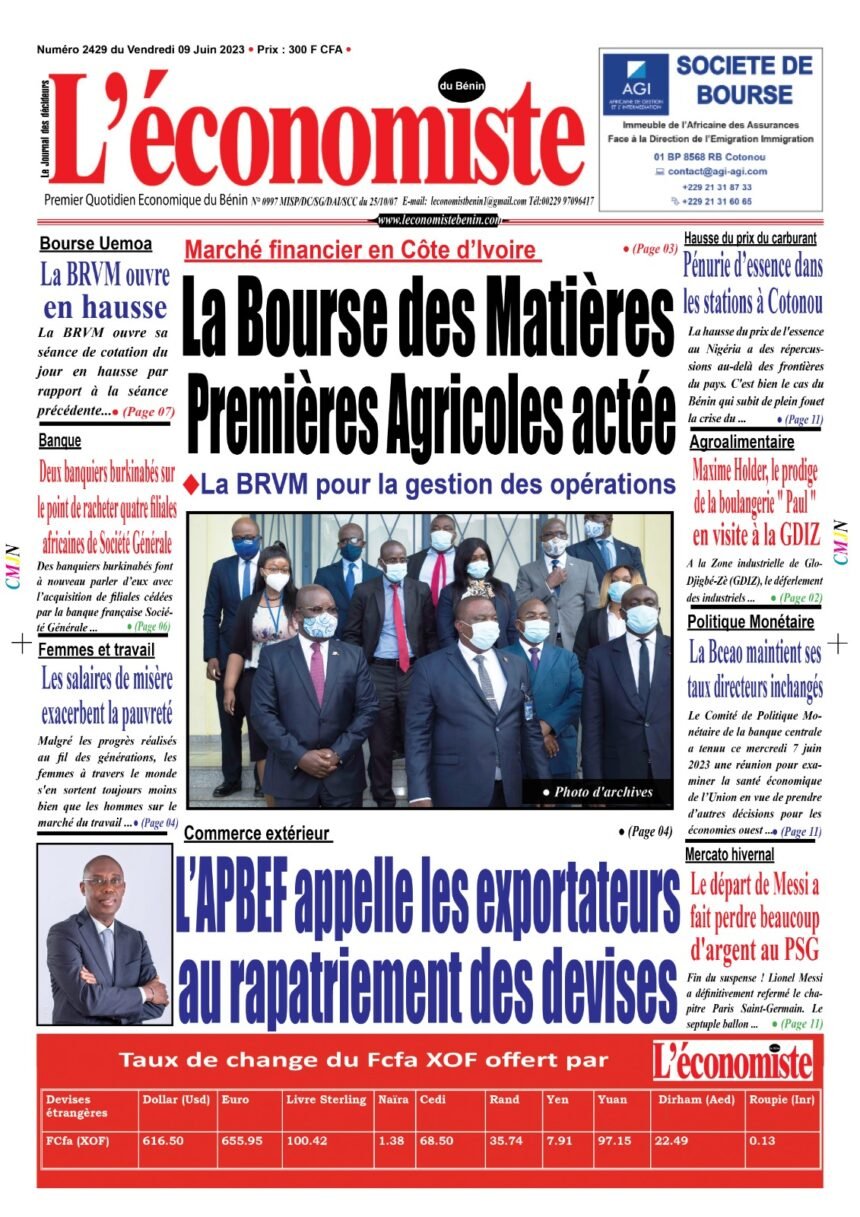 DERNIERES PARUTIONSParution du 09 06 2023 Dernière mise à jour: juin 9, 2023 9:12 am la rédaction Publié juin 9, 2023 Partager PARTAGER Vous Aimerez Aussi Parution du 06 04 2023 Parution du 31 08 2023 Parution du 09 11 2022 Parution du 05 06 2023 Parution du 12 04 2023 Partager Cet Article Facebook Pinterest Whatsapp Whatsapp LinkedIn Télégramme E-mail Imprimer Article Précédent Marché financier en Côte d’Ivoire : La Bourse des Matières Premières Agricoles actée Prochain Article Banque centrale du Nigeria: Le gouverneur de Godwin Emefiele, arrêté par le DSS RechercherRechercherDerniers articlesSemaine Boursière à la BRVM : Une Élan entre Montées et BaisseEntretien avec Dr. Asma Razgallah,Présidente-Fondatrice de Strat.IN CanadaRéalisation de garderie à l’UAC: Le Japon alloue plus 50 millions FCFA à l’Ong « Graines de Paix-Bénin »Renforcement des entrepreneurs à l’export: La CCI Bénin outille les entreprises à l’accès aux marchés internationauxLibre-échange en Afrique: ZLECAF, l’une des priorités de la CEDEAO en 2026CommentairesAucun commentaire à afficher.