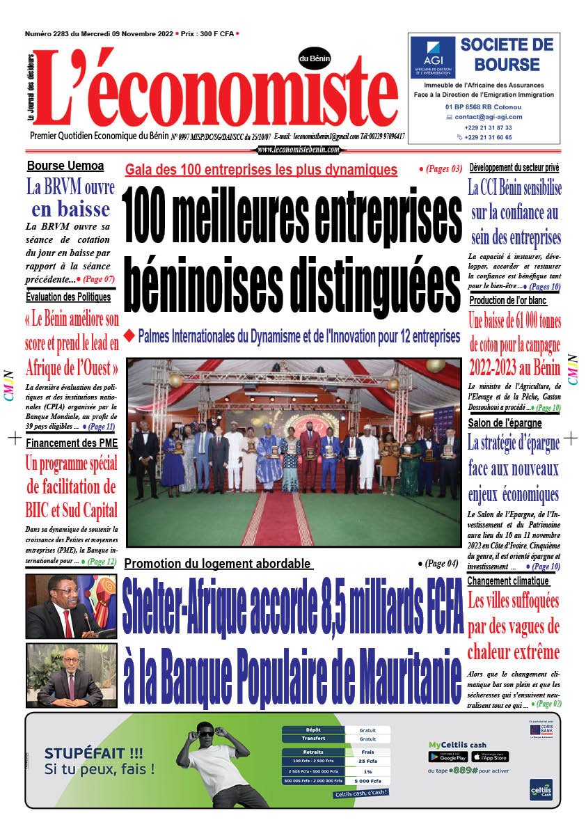 DERNIERES PARUTIONSParution du 09 11 2022 Dernière mise à jour: novembre 8, 2022 11:19 pm Houefa Publié novembre 8, 2022 Partager PARTAGER Vous Aimerez Aussi Parution du 08 12 2022 Parution du 20 06 2023 Parution 26 10 2022 Parution du 05 09 2023 Parution 27 10 2022 Partager Cet Article Facebook Pinterest Whatsapp Whatsapp LinkedIn Télégramme E-mail Imprimer Article Précédent Évaluation des Politiques et des Institutions Nationales 2022 : « Le Bénin améliore son score et prend le lead en Afrique de l’Ouest » Prochain Article Pénurie mondiale d’engrais azotés : Les prix ont augmenté de 193% depuis 2020 Leave a CommentLaisser un commentaire Annuler la réponseVotre adresse e-mail ne sera pas publiée. Les champs obligatoires sont indiqués avec *Commentaire *Nom * E-mail * Site web Enregistrer mon nom, mon e-mail et mon site dans le navigateur pour mon prochain commentaire. ΔRechercherRechercherDerniers articlesLutte contre la criminalité transnationale: Magistrats et policiers renforcent leur entraide judiciaireExportation de produits agricoles du Bénin: L’ananas pain de sucre conquiert le marché chinoisPrésidentielle 2026: Le duo Wadagni–Talata dévoile sa vision pour le Bénin ce samediSIRAT Pay : une solution digitale pour fluidifier les péagesArt conceptuel: Thierry Oussou expose « Equilibrium Wind » du 21 mars au 18 avril 2026CommentairesAucun commentaire à afficher.