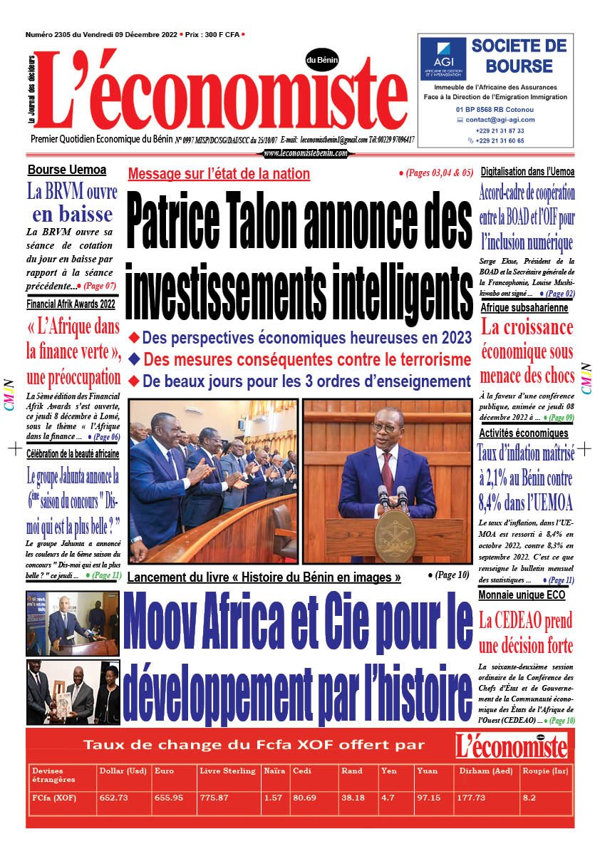 DERNIERES PARUTIONSParution du 09 12 2022 Dernière mise à jour: décembre 8, 2022 11:13 pm Houefa Publié décembre 8, 2022 Partager PARTAGER Vous Aimerez Aussi Parution du 15 05 2023 Parution du 11 01 2023 Parution du 29 06 2023 Parution du 12 07 2023 Parution du 20 10 22 Partager Cet Article Facebook Pinterest Whatsapp Whatsapp LinkedIn Télégramme E-mail Imprimer Article Précédent Lancement du livre « Histoire du Bénin en images » : Moov Africa et Cie promeuvent le développement par l’histoire Prochain Article Changement climatique : Baisse de 13% de la production mondiale du sucre en 2022-2023 RechercherRechercherDerniers articlesLutte contre la criminalité transnationale: Magistrats et policiers renforcent leur entraide judiciaireExportation de produits agricoles du Bénin: L’ananas pain de sucre conquiert le marché chinoisPrésidentielle 2026: Le duo Wadagni–Talata dévoile sa vision pour le Bénin ce samediSIRAT Pay : une solution digitale pour fluidifier les péagesArt conceptuel: Thierry Oussou expose « Equilibrium Wind » du 21 mars au 18 avril 2026CommentairesAucun commentaire à afficher.