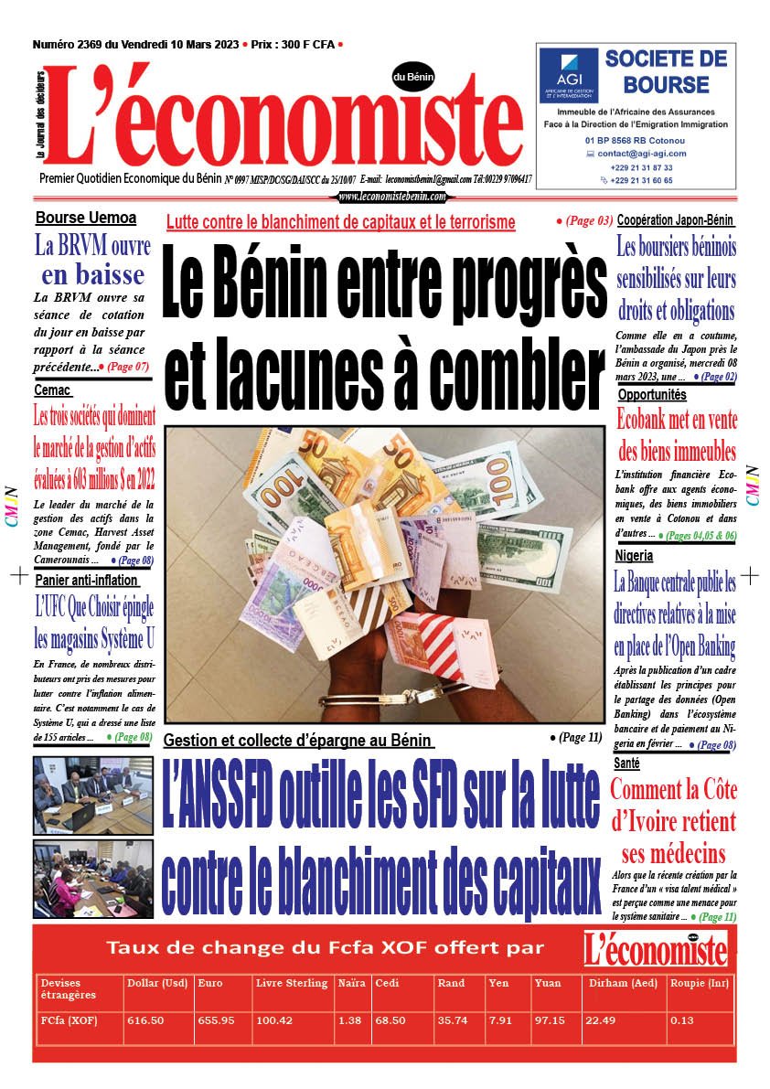 DERNIERES PARUTIONSParution du 10 03 2023 Dernière mise à jour: mars 9, 2023 11:11 pm Houefa Publié mars 9, 2023 Partager PARTAGER Vous Aimerez Aussi Parution du 21 12 2022 Parution du 09 06 2023 Parution du 26 09 2023 Parution du 02 01 2023 Parution du 01 02 2023 Partager Cet Article Facebook Pinterest Whatsapp Whatsapp LinkedIn Télégramme E-mail Imprimer Article Précédent Lutte contre le blanchiment de capitaux et le terrorisme : Le Bénin entre progrès et lacunes à combler Prochain Article Comité de gestion des gares de Bohicon : Alexis Ahodji élu président des acteurs RechercherRechercherDerniers articlesEntrepreneuriat au Bénin: BIO Invest engage 3 millions d’euros dans Vital Finance pour les PMEMarché des titres publics: 8ᵉ édition des Rencontres du Marché des Titres Publics (REMTP), les 27et 28 à LoméStabilité macroéconomique: Un taux de croissance de 6,9 % dans l’UEMOA à fin 2025Accompagnement et suivi des entreprises: La CCI Bénin projette une croissance de 91% aux PME en 2026Dynamisme à la BRVM : Les Valeurs Bancaires et Industrielles en TêteCommentairesAucun commentaire à afficher.