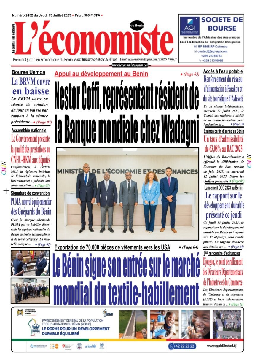 DERNIERES PARUTIONSParution du 12 07 2023 Dernière mise à jour: juillet 12, 2023 11:42 pm la rédaction Publié juillet 12, 2023 Partager PARTAGER Vous Aimerez Aussi Parution du 14 02 2023 Parution du 21 10 22 Parution du 06 12 2022 Parution du 02 03 2023 Parution du 26 09 2023 Partager Cet Article Facebook Pinterest Whatsapp Whatsapp LinkedIn Télégramme E-mail Imprimer Article Précédent Appui au développement au Bénin : Nestor Coffi, représentant résident de la Banque mondiale chez Wadagni Prochain Article Relations bénino-nigérianes : Patrice Talon et Aliko Dangote, le nouveau départ ! RechercherRechercherDerniers articlesOrdre des Avocats du Bénin: Zachari Baba Body investi nouveau bâtonnierBRVM: Les valeurs financières propulsent le marchéIntégration: La CEDEAO préoccupée par son avenirFONI 2026 en Guinée Conakry et expansion d’Afrik Créances: Blaise AHOUANTCHEDE reçu par le ministre Mourana SOUMAHJeunesse en Action : Le Bénin Triomphe au Concours Oratoire du GIABACommentairesAucun commentaire à afficher.