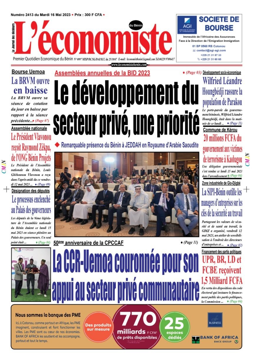 DERNIERES PARUTIONSParution du 16 05 2023 Dernière mise à jour: mai 16, 2023 12:33 am la rédaction Publié mai 16, 2023 Partager PARTAGER Vous Aimerez Aussi Parution du 02 11 2023 Parution 28 10 2022 Parution du 25 05 2023 Parution du 22 05 2023 Parution du 18 01 2021 Partager Cet Article Facebook Pinterest Whatsapp Whatsapp LinkedIn Télégramme E-mail Imprimer Article Précédent Assemblée nationale : Le Président Vlavonou reçoit Raymond Zèkpa, de l’ONG Bénin Projets Prochain Article Promotion du patrimoine africain : Les Maires d’Afrique à Rabat les 23 et 24 mai pour l’économie de la culture RechercherRechercherDerniers articlesPrésentation du projet de société Wadagni-Talata : priorités socialesCélébration de l’Aïd el-Fitr : le message de Abdoulaye Bio Tchané aux BéninoisCohorte 2026 du Programme TEF : un nouvel élan pour l’entrepreneuriat africainLutte contre la criminalité transnationale: Magistrats et policiers renforcent leur entraide judiciaireExportation de produits agricoles du Bénin: L’ananas pain de sucre conquiert le marché chinoisCommentairesAucun commentaire à afficher.