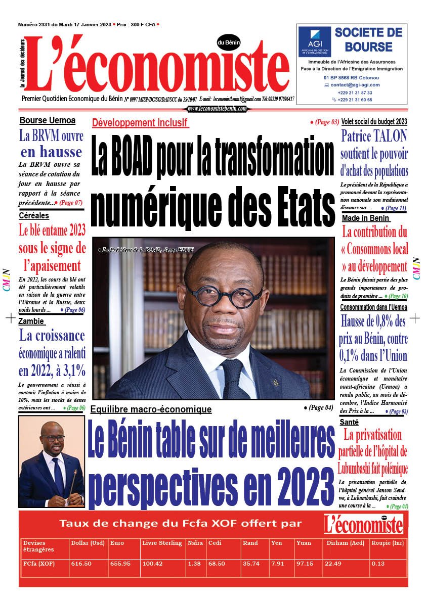 DERNIERES PARUTIONSParution du 17 01 2023 Dernière mise à jour: janvier 16, 2023 9:56 pm Houefa Publié janvier 16, 2023 Partager PARTAGER Vous Aimerez Aussi Parution du 01 03 2023 Parution du 02 02 2024 Parution du 10 02 2023 Parution du 26 09 2023 Parution du 20 09 2023 Partager Cet Article Facebook Pinterest Whatsapp Whatsapp LinkedIn Télégramme E-mail Imprimer Article Précédent Développement inclusif : La BOAD pour la transformation numérique des Etats Prochain Article Audiovisuel : CANAL+ lance ÔBATANGA, nouvelle série CANAL+ORIGINAL en Afrique RechercherRechercherDerniers articlesSemaine Boursière à la BRVM : Une Élan entre Montées et BaisseEntretien avec Dr. Asma Razgallah,Présidente-Fondatrice de Strat.IN CanadaRéalisation de garderie à l’UAC: Le Japon alloue plus 50 millions FCFA à l’Ong « Graines de Paix-Bénin »Renforcement des entrepreneurs à l’export: La CCI Bénin outille les entreprises à l’accès aux marchés internationauxLibre-échange en Afrique: ZLECAF, l’une des priorités de la CEDEAO en 2026CommentairesAucun commentaire à afficher.