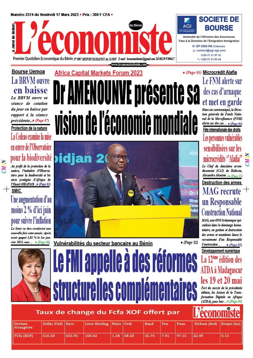 DERNIERES PARUTIONSParution du 17 03 2023 Dernière mise à jour: mars 16, 2023 11:23 pm Houefa Publié mars 16, 2023 Partager PARTAGER Vous Aimerez Aussi Parution du 03 11 2023 Parution du 21 09 2023 Parution du 19 12 2022 Parution du 16 11 2023 Parution du 26 09 2023 Partager Cet Article Facebook Pinterest Whatsapp Whatsapp LinkedIn Télégramme E-mail Imprimer Article Précédent Africa Capital Markets Forum 2023 : Dr AMENOUNVE présente sa vision de l’économie mondiale Prochain Article 8ème réunion de la Commission-CCR : Priorité au suivi des travaux du siège de la CCR-Uemoa RechercherRechercherDerniers articlesSemaine Boursière à la BRVM : Une Élan entre Montées et BaisseEntretien avec Dr. Asma Razgallah,Présidente-Fondatrice de Strat.IN CanadaRéalisation de garderie à l’UAC: Le Japon alloue plus 50 millions FCFA à l’Ong « Graines de Paix-Bénin »Renforcement des entrepreneurs à l’export: La CCI Bénin outille les entreprises à l’accès aux marchés internationauxLibre-échange en Afrique: ZLECAF, l’une des priorités de la CEDEAO en 2026CommentairesAucun commentaire à afficher.