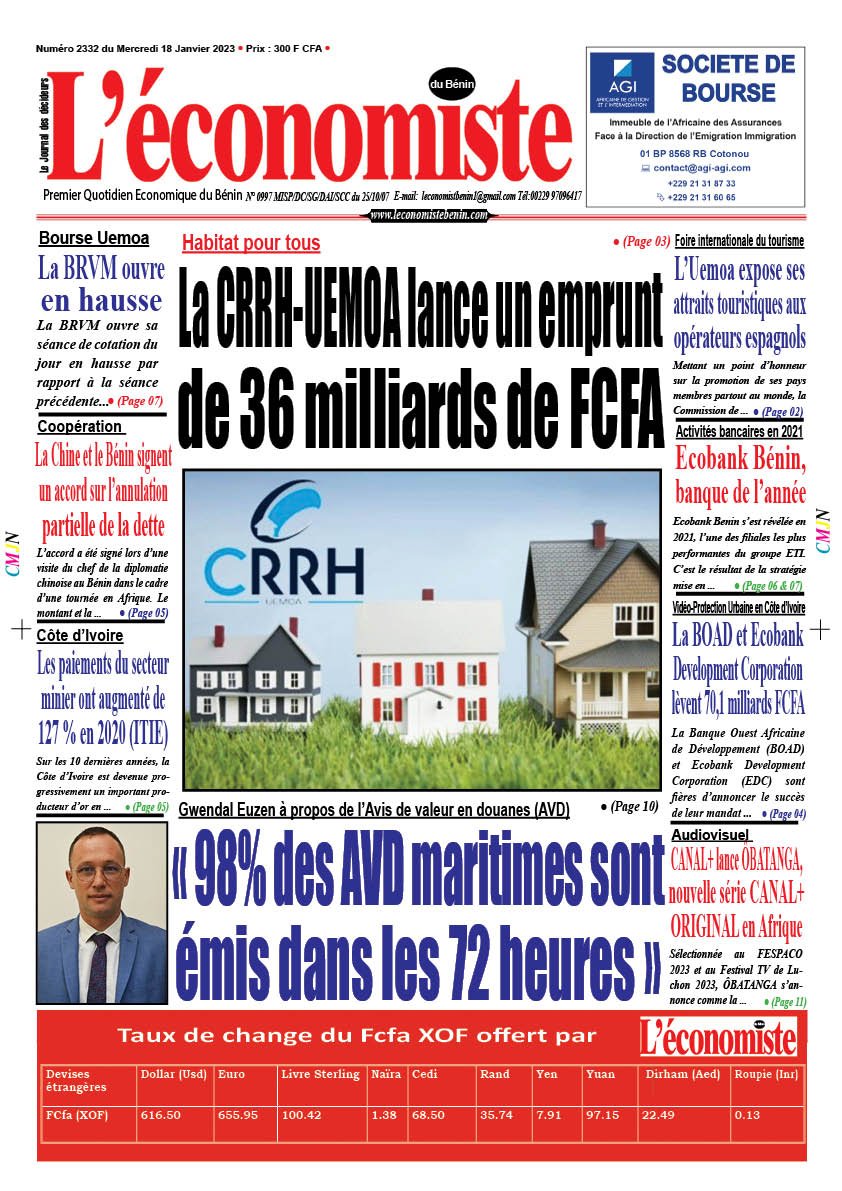 DERNIERES PARUTIONSParution du 18 01 2021 Dernière mise à jour: janvier 17, 2023 9:46 pm Houefa Publié janvier 17, 2023 Partager PARTAGER Vous Aimerez Aussi Parution du 25 08 2023 Parution du 06 09 2023 Parution du 02 11 2022 Parution du 23 05 2023 Parution du 19 05 2023 Partager Cet Article Facebook Pinterest Whatsapp Whatsapp LinkedIn Télégramme E-mail Imprimer Article Précédent Habitat pour tous : La CRRH-UEMOA lance un emprunt de 36 milliards de FCFA Prochain Article Gestion budgétaire et marchés publics : Les acteurs communaux formés sur le SYCOREF RechercherRechercherDerniers articlesOuverture de la BRVM : Un Marché en Légère ProgressionOpportunité d’étude à l’extérieur: 16 Bourses internationales offertes aux étudiantsEntrepreneuriat au Bénin: BIO Invest engage 3 millions d’euros dans Vital Finance pour les PMEMarché des titres publics: 8ᵉ édition des Rencontres du Marché des Titres Publics (REMTP), les 27et 28 à LoméStabilité macroéconomique: Un taux de croissance de 6,9 % dans l’UEMOA à fin 2025CommentairesAucun commentaire à afficher.