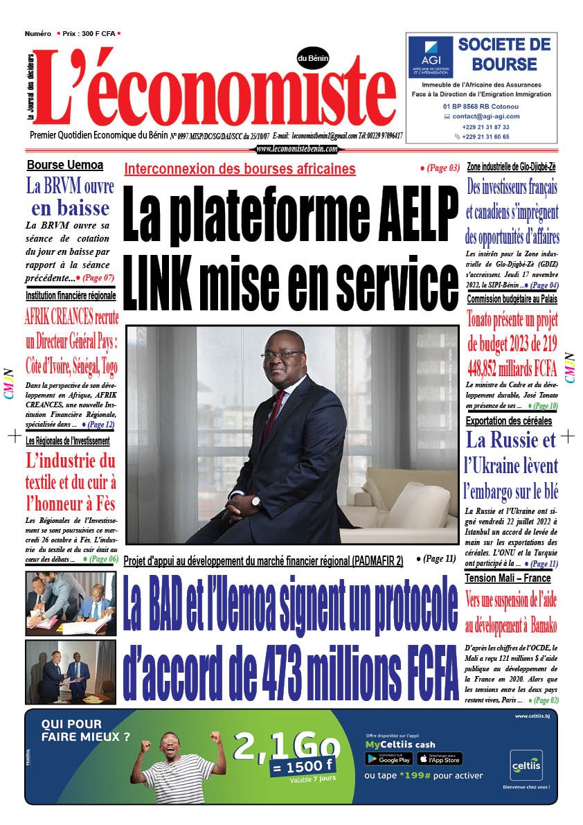 DERNIERES PARUTIONSParution du 18 11 2022 Dernière mise à jour: novembre 17, 2022 11:28 pm Houefa Publié novembre 17, 2022 Partager PARTAGER Vous Aimerez Aussi Parution du 15 05 2023 Parution du 22 08 2023 Parution du 23 11 2022 Parution du 19 09 2023 Parution du 02 10 2023 Partager Cet Article Facebook Pinterest Whatsapp Whatsapp LinkedIn Télégramme E-mail Imprimer Article Précédent Interconnexion des bourses africaines: La plateforme AELP LINK mise en service Prochain Article Cinéma au Bénin : Tranquillin lance son premier court-métrage dénommé « « Ma belle Mère » Leave a CommentLaisser un commentaire Annuler la réponseVotre adresse e-mail ne sera pas publiée. Les champs obligatoires sont indiqués avec *Commentaire *Nom * E-mail * Site web Enregistrer mon nom, mon e-mail et mon site dans le navigateur pour mon prochain commentaire. ΔRechercherRechercherDerniers articlesIntégration numérique et création d’emplois: La Banque mondiale alloue 137 millions de dollars au Bénin et à deux autres paysEducation financière: Le chaînon faible de l’inclusionPolémique autour de certains bouchons de l’eau minérale FIFA : La société E.T.E clarifie et rassure ses consommateursConseil des ministres au Bénin : principales décisions du mercredi 11 mars 2026JIF 2026: Message du Maire de Cotonou aux femmesCommentairesAucun commentaire à afficher.