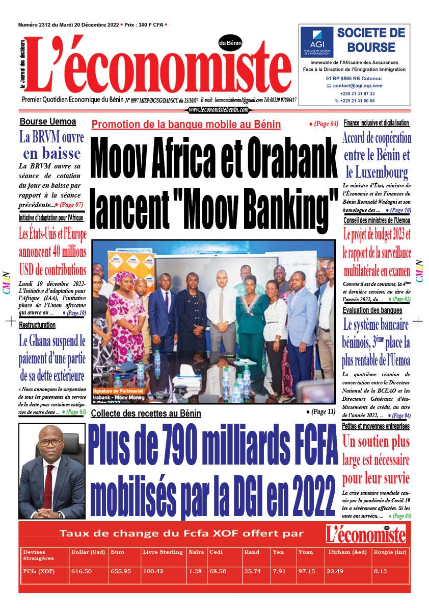 ECO-ACTUParution du 20 12 2022 Dernière mise à jour: décembre 19, 2022 11:36 pm Houefa Publié décembre 19, 2022 Partager PARTAGER Vous Aimerez Aussi Forum mondial des réfugiés: L’ONU insiste sur leur contribution à l’économie Echanges commerciaux : Le Bénin exporte 53,4% de cajou et 25,8% du coton en Inde Dépenses publiques au Bénin en 2024 : Un budget de 3.199 milliards FCFA pour 6,5% de croissance 3e forum de l’Alliance Afrique:Le défie d’une agriculture intelligente Réhabilitation d’infrastructures routières : Bientôt, des accords entre le Niger et le Bénin Partager Cet Article Facebook Pinterest Whatsapp Whatsapp LinkedIn Télégramme E-mail Imprimer Article Précédent Promotion de la banque mobile au Bénin : Moov Africa et Orabank lancent « Moov Banking » Prochain Article Assises de la Transformation Digitale en Afrique (ATAD) de 2022 : 11 recommandations pour promouvoir une économie numérique souveraine, sûre et inclusive RechercherRechercherDerniers articlesOrdre des Avocats du Bénin: Zachari Baba Body investi nouveau bâtonnierBRVM: Les valeurs financières propulsent le marchéIntégration: La CEDEAO préoccupée par son avenirFONI 2026 en Guinée Conakry et expansion d’Afrik Créances: Blaise AHOUANTCHEDE reçu par le ministre Mourana SOUMAHJeunesse en Action : Le Bénin Triomphe au Concours Oratoire du GIABACommentairesAucun commentaire à afficher.
