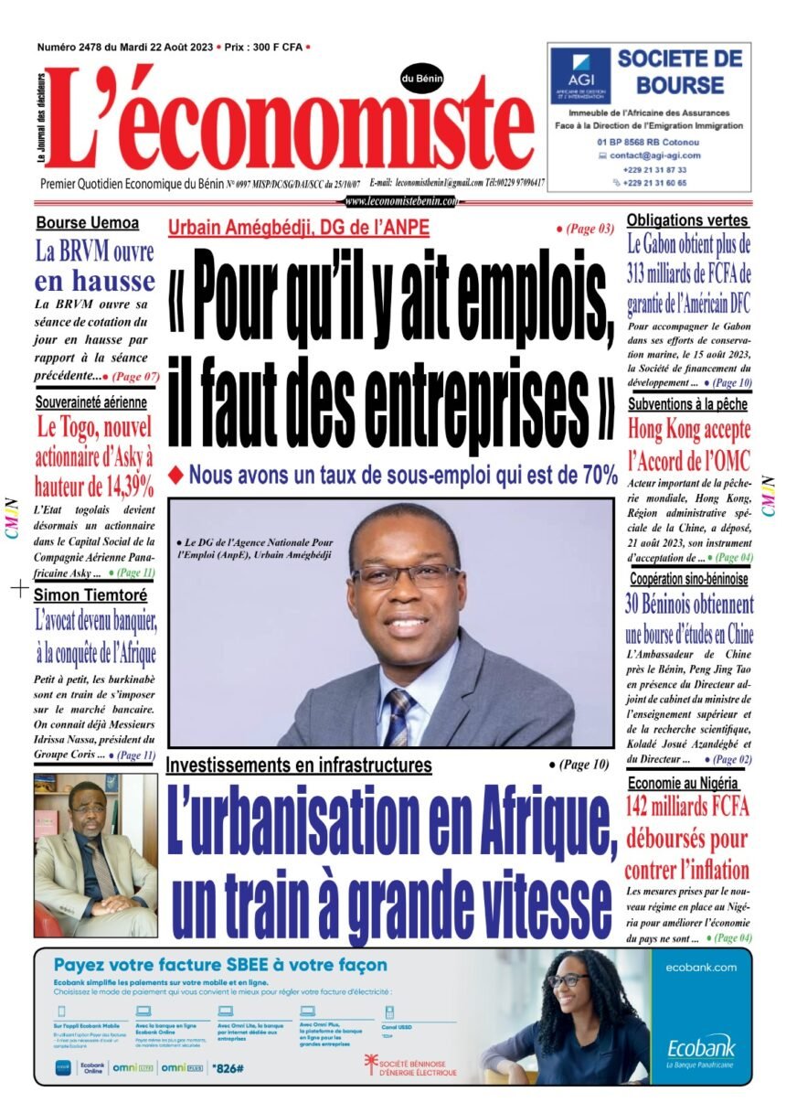 DERNIERES PARUTIONSParution du 22 08 2023 Dernière mise à jour: août 22, 2023 12:56 am la rédaction Publié août 22, 2023 Partager 0 Min en Lecture PARTAGER Vous Aimerez Aussi Parution du 25 08 2023 Parution du 19 09 2023 Parution du 06 03 2023 Parution du 01 03 2023 Parution du 03 11 2023 Partager Cet Article Facebook Pinterest Whatsapp Whatsapp LinkedIn Télégramme E-mail Imprimer Article Précédent Urbain Amégbédji, DG de l’ANPE : « Pour qu’il y ait emplois, il faut des entreprises » Prochain Article Politique monétaire : La réserve du Nigeria estimée à plus de 2 000 milliards de FCFA RechercherRechercherDerniers articlesMarché des Titres Publics: « Le marché secondaire entre dans une véritable phase de régulation », dixit Constantin DABIREClimat des affaires/rapport Business Ready 2025: Le Bénin réalise des prouesses dans l’UEMOA et la CEDEAOMarché financier régional: La BRVM accentue son dynamisme en ce début d’annéeUEMOA : La Cour de justice lève les sanctions contre le MaliAccès à l’Energie au Bénin: 09 mini-réseaux solaires ruraux financés par CEI Africa et Energise AfricaCommentairesAucun commentaire à afficher.