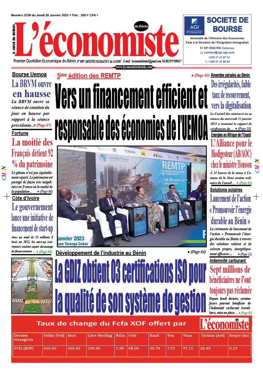 DERNIERES PARUTIONSParution du 26 01 2023 Dernière mise à jour: janvier 25, 2023 10:53 pm Houefa Publié janvier 25, 2023 Partager PARTAGER Vous Aimerez Aussi 1ère édition du Prix de la Qualité et de la Performance : La clôture du dépôt des candidatures repoussée au 13 novembre Parution du 06 04 2023 Parution du 10 10 2023 Parution du 05 12 2022 Parution du 24 07 2023 Partager Cet Article Facebook Pinterest Whatsapp Whatsapp LinkedIn Télégramme E-mail Imprimer Article Précédent 5ème édition des REMTP : Vers un financement efficient et responsable des économies de l’UEMOA Prochain Article 1ère session ordinaire du Conseil communal de Djougou : Fin de mission pour le maire Abdoul Malik Séibou RechercherRechercherDerniers articlesMarché des Titres Publics: « Le marché secondaire entre dans une véritable phase de régulation », dixit Constantin DABIREClimat des affaires/rapport Business Ready 2025: Le Bénin réalise des prouesses dans l’UEMOA et la CEDEAOMarché financier régional: La BRVM accentue son dynamisme en ce début d’annéeUEMOA : La Cour de justice lève les sanctions contre le MaliAccès à l’Energie au Bénin: 09 mini-réseaux solaires ruraux financés par CEI Africa et Energise AfricaCommentairesAucun commentaire à afficher.