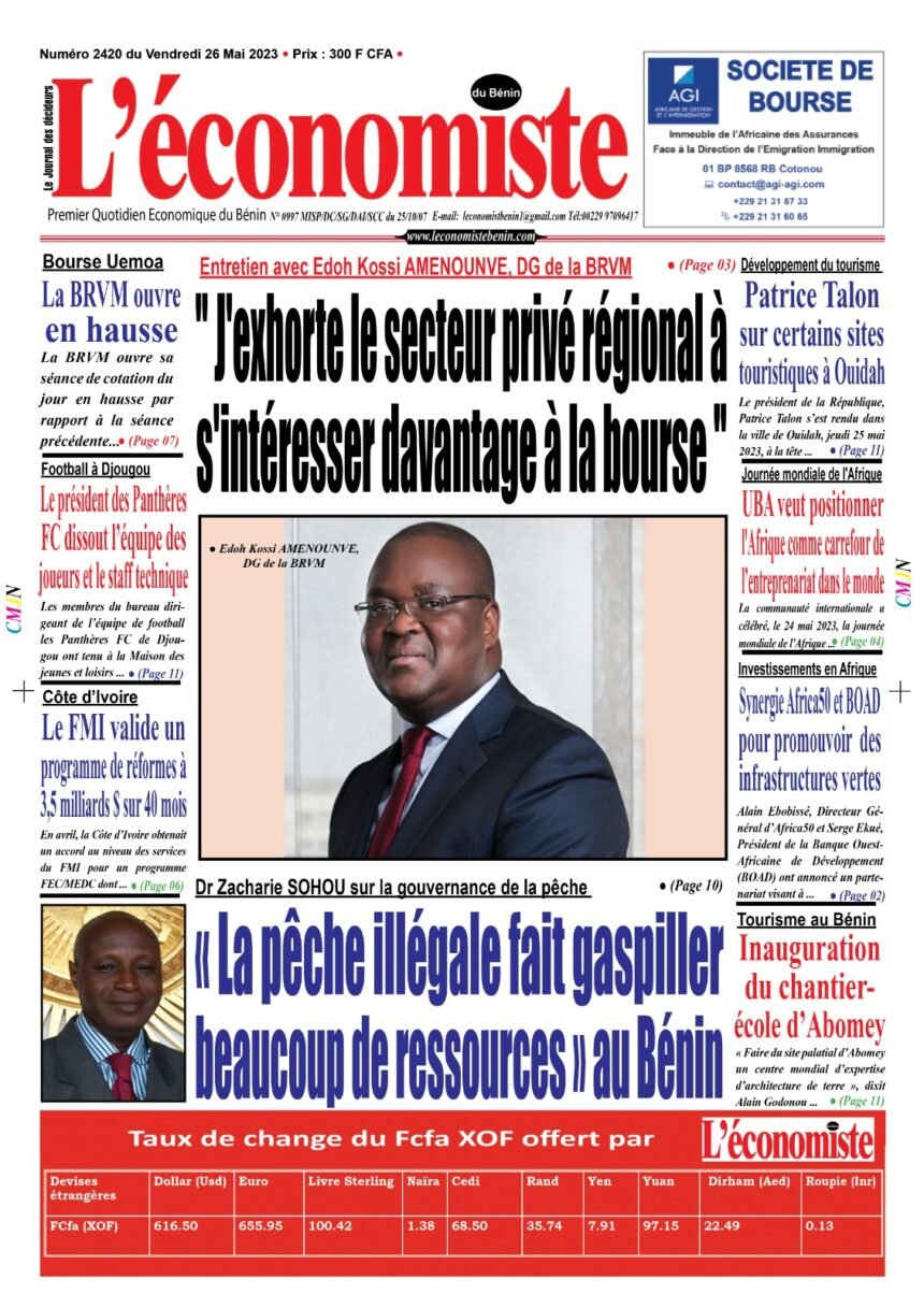 DERNIERES PARUTIONSParution du 26 05 2023 Dernière mise à jour: mai 26, 2023 9:26 am la rédaction Publié mai 26, 2023 Partager 0 Min en Lecture PARTAGER Vous Aimerez Aussi Parution du 31 08 2023 Parution du 25 07 2023 Parution du 26 01 2023 Parution du 24 03 2023 Parution du 13 02 2023 Partager Cet Article Facebook Pinterest Whatsapp Whatsapp LinkedIn Télégramme E-mail Imprimer Article Précédent Tourisme au Bénin : Inauguration du chantier-école d’Abomey Prochain Article Nigéria : Bola Tinubu promet alléger la pression sur les finances publiques RechercherRechercherDerniers articlesOuverture de la BRVM : Un Marché en Légère ProgressionOpportunité d’étude à l’extérieur: 16 Bourses internationales offertes aux étudiantsEntrepreneuriat au Bénin: BIO Invest engage 3 millions d’euros dans Vital Finance pour les PMEMarché des titres publics: 8ᵉ édition des Rencontres du Marché des Titres Publics (REMTP), les 27et 28 à LoméStabilité macroéconomique: Un taux de croissance de 6,9 % dans l’UEMOA à fin 2025CommentairesAucun commentaire à afficher.