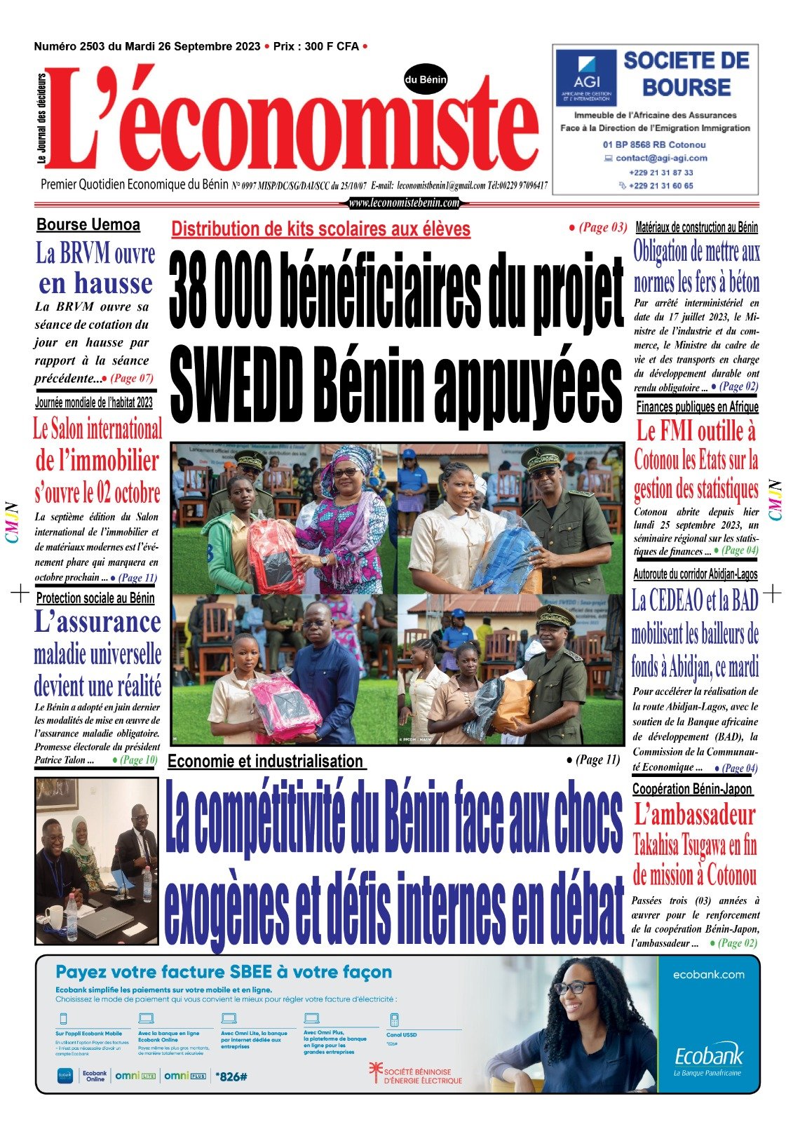DERNIERES PARUTIONSParution du 26 09 2023 Dernière mise à jour: septembre 26, 2023 7:04 am la rédaction Publié septembre 26, 2023 Partager 0 Min en Lecture PARTAGER Vous Aimerez Aussi Parution du 20 01 2023 Parution du 22 06 2023 Parution du 26 01 2023 Parution du 22 08 2023 Parution du 12 06 2023 Partager Cet Article Facebook Pinterest Whatsapp Whatsapp LinkedIn Télégramme E-mail Imprimer Article Précédent Matériaux de construction au Bénin : Obligation de mettre aux normes les fers à béton Prochain Article Dépenses publiques au Bénin en 2024 : Un budget de 3.199 milliards FCFA pour 6,5% de croissance RechercherRechercherDerniers articlesEntrepreneuriat au Bénin: BIO Invest engage 3 millions d’euros dans Vital Finance pour les PMEMarché des titres publics: 8ᵉ édition des Rencontres du Marché des Titres Publics (REMTP), les 27et 28 à LoméStabilité macroéconomique: Un taux de croissance de 6,9 % dans l’UEMOA à fin 2025Accompagnement et suivi des entreprises: La CCI Bénin projette une croissance de 91% aux PME en 2026Dynamisme à la BRVM : Les Valeurs Bancaires et Industrielles en TêteCommentairesAucun commentaire à afficher.