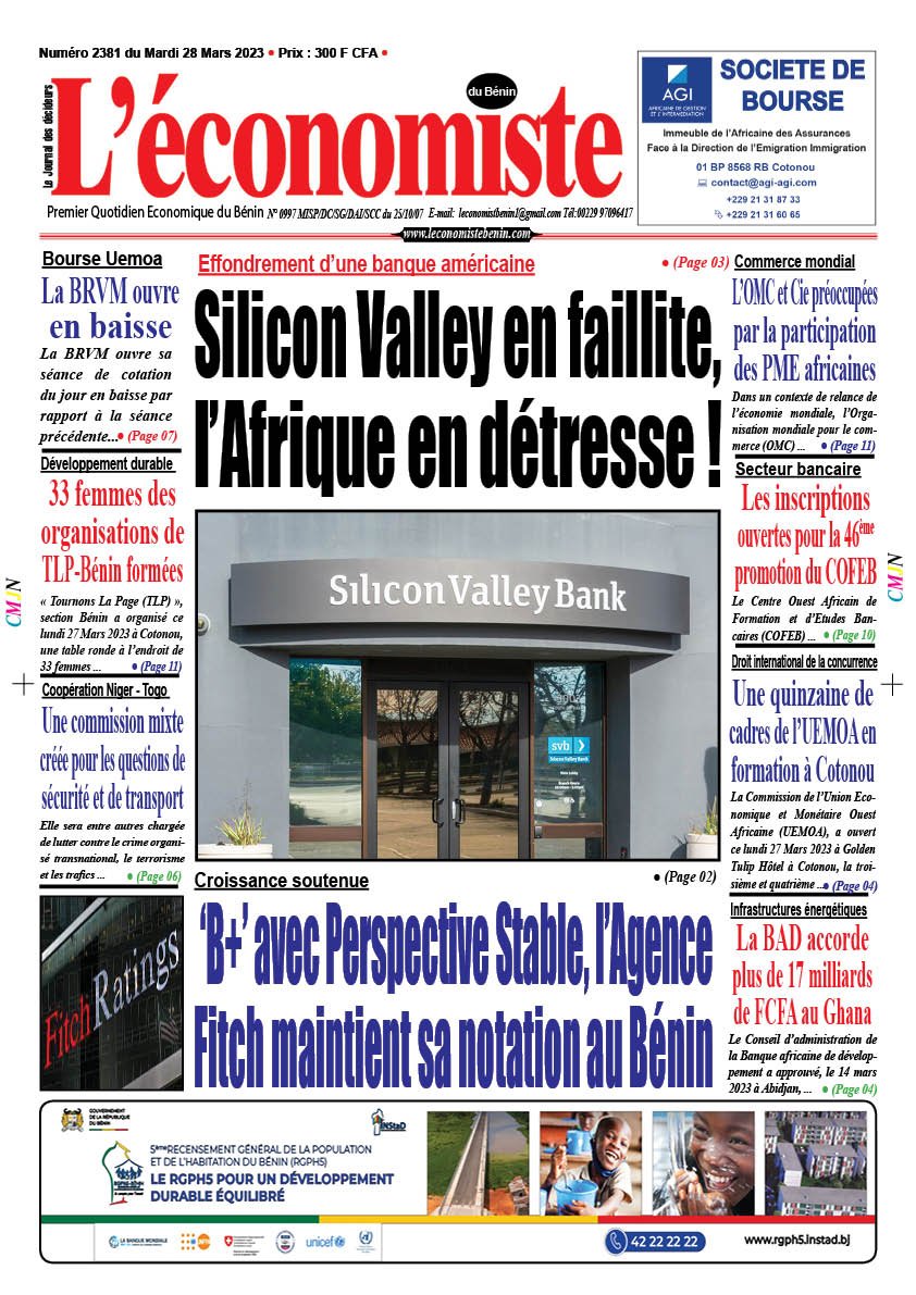 DERNIERES PARUTIONSParution du 28 03 2023 Dernière mise à jour: mars 27, 2023 11:34 pm Houefa Publié mars 27, 2023 Partager PARTAGER Vous Aimerez Aussi Parution du 05 06 2023 Parution du 07 12 2022 Parution du 11 01 2023 Parution du 20 07 2023 Parution du 27 02 2023 Partager Cet Article Facebook Pinterest Whatsapp Whatsapp LinkedIn Télégramme E-mail Imprimer Article Précédent Effondrement d’une banque américaine : Silicon Valley en faillite, l’Afrique en détresse ! Prochain Article Sécurité alimentaire dans l’Uemoa : La structuration de la filière bétail-viande en discussion RechercherRechercherDerniers articlesOrdre des Avocats du Bénin: Zachari Baba Body investi nouveau bâtonnierBRVM: Les valeurs financières propulsent le marchéIntégration: La CEDEAO préoccupée par son avenirFONI 2026 en Guinée Conakry et expansion d’Afrik Créances: Blaise AHOUANTCHEDE reçu par le ministre Mourana SOUMAHJeunesse en Action : Le Bénin Triomphe au Concours Oratoire du GIABACommentairesAucun commentaire à afficher.