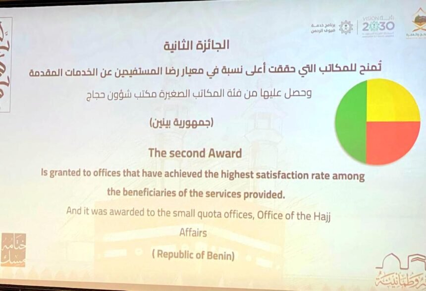 « Les autorités saoudiennes ont procédé le mardi 18 juin 2024 à la clôture du Hadj 2024. La cérémonie qui marque la fin du pèlerinage a été l’occasion pour les organisateurs de décerner des prix à plusieurs pays. Parmi eux, le Bénin, qui décroche le deuxième prix, décerné aux pays ayant réalisé la performance en termes de satisfaction des pèlerins quant aux services fournis ». 2.300, c’est le quota voulu et obtenu cette année par le Bénin pour les pèlerins au Hadj. Ce chiffre qui rompt avec les précédents vise à limiter, entre autres, les pertes enregistrées au cours des années précédentes et permettre une meilleure organisation du pèlerinage. Et ce choix du Gouvernement est salué à juste titre par l’Arabie Saoudite, pays organisateur. En effet, à la cérémonie de clôture du Hadj 2024 le mardi 18 juin, le Bénin a été distingué dans la catégorie des Offices du Hadj à quota modeste, aux côtés de la Jordanie et de la Malaisie. C’est le deuxième prix décerné pour la performance réalisée en termes de satisfaction des pèlerins quant aux services fournis. Cette reconnaissance de l’Arabie Saoudite vient approuver la vision du Gouvernement béninois pour le Hadj, soutenue par le Président de la République, Patrice TALON. Les multiples réformes dans le secteur ont été renforcées cette année par le Comité d’Orientation et de Supervision du Hadj, que préside le ministre Olushegun ADJADI BAKARI des Affaires étrangères. Après une évaluation, le COS-Hadj, soutenu par AGLO (Agence pour la Gestion de la Logistique des Officiels), a multiplié les rencontres avec tous les acteurs impliqués dans l’organisation pour satisfaire aux exigences des autorités saoudiennes et améliorer les services fournis aux pèlerins. En reconnaissance de sa performance, le Bénin, ainsi que les pays primés auront le privilège de personnaliser, à compter de ce jour, leurs emplacements sur les sites rituels pour l’édition 2025 du Hadj, a souligné, Riyad.