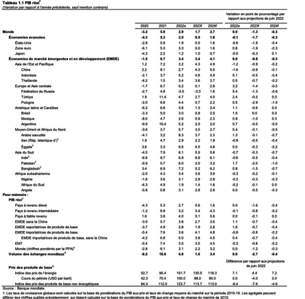 La croissance de l’économie mondiale devrait s’établir à 1,7 % en 2023, puis à 2,7% en 2024. On anticipe un ralentissement marqué et généralisé, les prévisions étant revues à la baisse pour 95 % des économies avancées et près de 70 % des économies de marché émergentes et en développement.