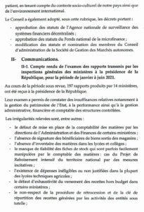 Défaut de mise en place de la comptabilité des matières par les directions de l’Administration et des Finances de certains ministères ; absence de signature des bénéficiaires de biens sortis des magasins ; absence d’inventaire des matières dans les lycées et collèges ; manque de fiabilité des fiches de stock qui sont parfois facilement manipulées par le comptable des matières : cas du Projet de Reboisement intensif du territoire national par des mesures incitatives ; dépenses inéligibles ou non justifiées dans la plupart des lycées techniques agricoles ; défaut d’exhaustivité du versement des recettes hors budget dans certains ministères ; le non-respect de la procédure de rétrocession et de la clé de répartition des recettes générées par les activités des entités sous tutelle ; utilisation des tickets-valeurs à des fins autres que celles des services, cas du chef du service administratif et financier de la Direction départementale du Cadre de Vie et du Développement Durable Ouémé-Plateau, qui a dépensé 2.200.000 FCFA de tickets valeurs à des fins personnelles ; non-archivage des liasses comptables ; le non-reversement, dans les délais, des reliquats d’activités ; défaut de prélèvement et de reversement de la TVA et de l’ AIB par certaines structures ; etc. C’est, entre autres, la série d’irrégularités relevées entre janvier et juin 2021 rapportées par 197 rapports issus des inspections générales de 14 ministères soumis à la présidence de la République. Au total, on note des moins perçus pour l’Etat s’élevant à la somme de 1.382.177.711 FCFA dont 88.889.578 FCFA sont déjà remboursés. Au fait, précise le Communiqué final du Conseil des ministres, l’examen de rapport a « permis de constater des insuffisances relatives notamment à la gestion du patrimoine de l’Etat, à la performance ainsi qu’à la gestion administrative, financière et comptable des structures contrôlées ». Un incivisme et un défaut d’orthodoxie que le gouvernement n’entend pas laisser impunis. Déjà, les ministres sont instruits pour faire mettre en débet par le ministre de l’Economie et des Finances, les mis en cause sans préjudice des sanctions disciplinaires et/ou poursuites judiciaires auxquelles les intéressés s’exposent. C’est dire que la mauvaise gestion a toujours la peau dure dans l’administration publique au Bénin.