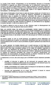 Le Comité Ouest-Africain d’Organisation et de Normalisation Bancaire et Financière (CONOBAFI) a organisé le vendredi 6 mai 2022 à l’hôtel Azalaï à Cotonou, une séance d’information sur le prélèvement interbancaire. Cette rencontre de sensibilisation a connu la présence de divers acteurs du système financier. Il s’agit des représentants de la Banque Centrale, de la profession bancaire, des grands facturiers, du Trésor Public, de la Direction Générale des impôts et de l’Agence Nationale de Normalisation, de Métrologie et du Contrôle Qualité. Cette activité du CONOBAFI à Cotonou vise à inciter les établissements teneurs de comptes à implémenter les modules nécessaires pour le traitement automatisé des opérations de prélèvement interbancaire.
