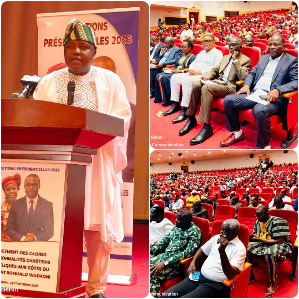 Les cadres et personnalités chrétiens évangéliques et le corps du Christ du Bénin, ont officialisé ce mercredi 01 octobre 2025, leur soutien à la candidature du duo Wadagni/Talata dans le cadre de la présidentielle 2026. A travers, une déclaration lue au Palais des Congrès à Cotonou dans l’après-midi de ce mercredi, les cadres évangéliques du Bénin ont exprimé leur total engagement aux côtés du candidat Romuald Wadagni et de sa colistière Mariam Chabi Talata Zimé Yérima. Cette cérémonie a été rehaussée par la présence du 1er Secrétaire du parti, Union Progressiste le Renouveau, GBENONCHI Gérard.